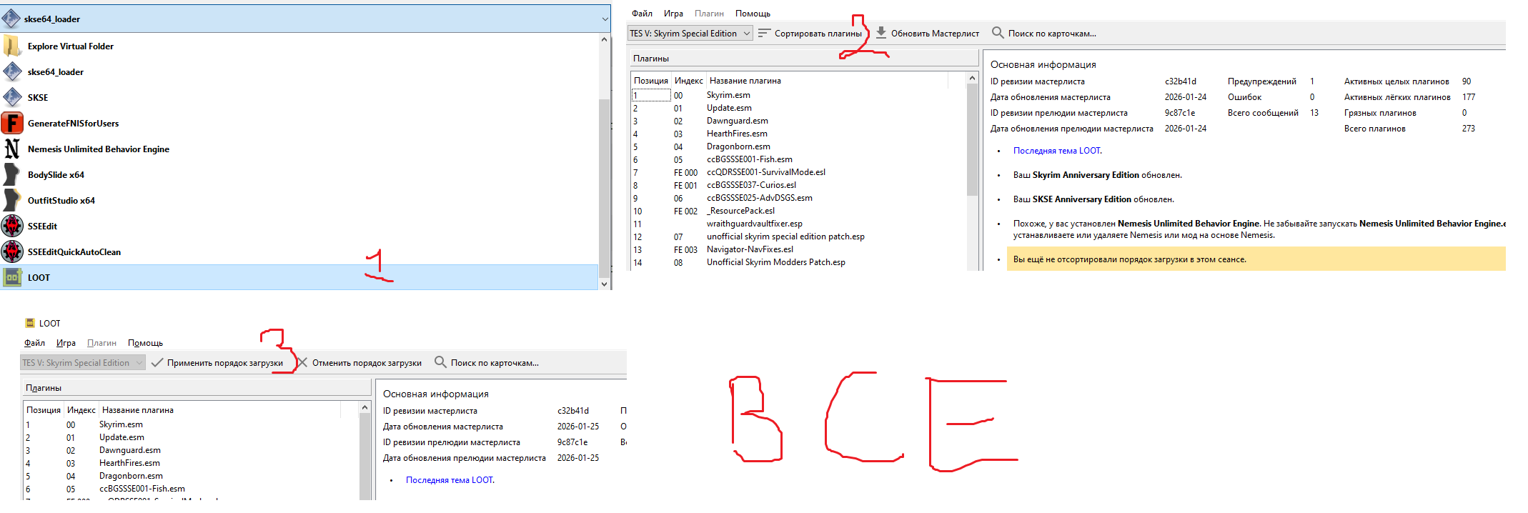 Особенности SSE: ➔ Самые популярные версии игры - 1.5.97, 1.6.640 и 1.6.1170 (Steam). ➔ Некоторые моды, связанные с SKSE, поддерживают не все версии игры. ➔ Skyrim Upscaler (есть в общей папке) и Lossless Scaling полезны как никогда. ➔ Война между проверенными старыми и перспективными новыми решениями нескончаема.