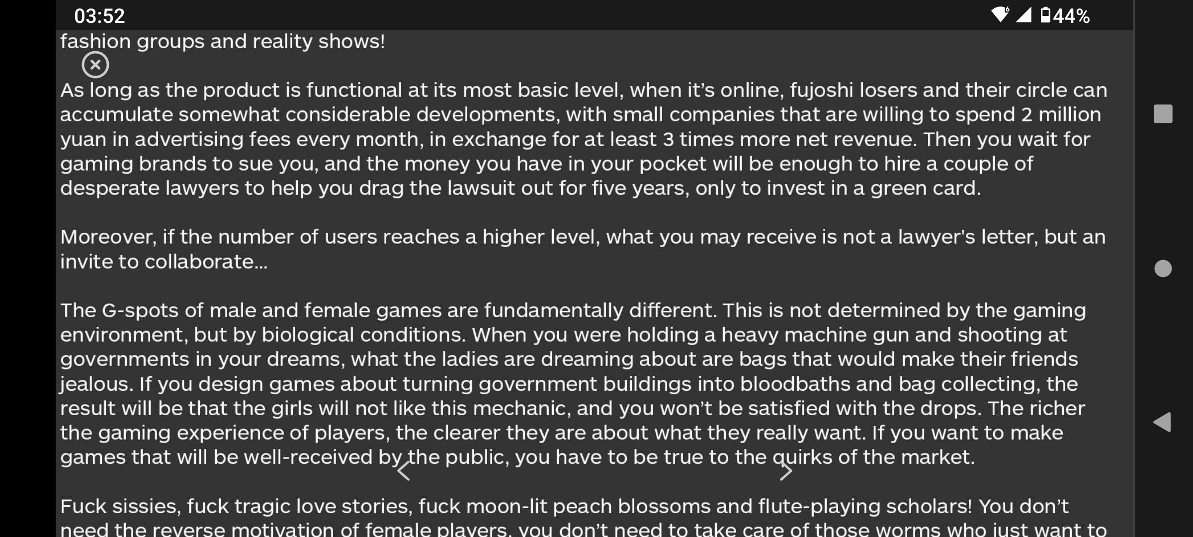 You casualfags never change, just like the Western game industry. Time and again you invoke that word you so dimly understand: fun, fun, fun. Fun has become the casual's rosary. You chant it like some apotropaic charm meant to ward off the threat of individuality. What you fail to realize is that far too many people play games for these braindead, cheap thrills. By only playing the same generic shit, you're closing yourself off to a much more fruitful avenue of gaming experience: immersion. While you're off camping kids on Xbox Live for the thousandth time, smug in your shell of guns and swearing, I'm visiting richly detailed worlds with interesting stories, themes, and characters, worlds where my imagination can grow and flourish without being stunted by hollywood 'realism'. It's a kind of deep satisfaction and contentment your cheap brown and bloom QTE thrills could never hope to match. Tell me, when did being afraid of something that looks "childish" in favour of some bald space marine, DLC-infested, season pass, EA shooter of the year become encouraged; even praised? It's casual--disgustingly casual--to obsess over nitty grittygeneric "manly" heroes and try to emulate their ways like a teenage girl wearing her mother's makeup. And don't bother pithing me by citing Metacritic scores, or current Gamespot reviews to tell me what a good game is. You may be worth less than the fake tan on your steroids but even you should know better than to fall for what the marketers tell you is popular this month. So to recap, my musclehead friend, there's a time and a place for Uncharted and CoD, for cheap thrills and casual amusement, but for you that's been every day of your by-the-numbers life, wasting your time, just so that society can count you as another sheep in the proverbial barn.
