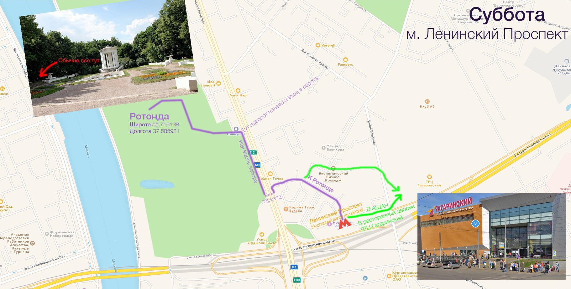Основная еженедельная сходка проходит в субботу, в Нескучном саду, около ротонды с 17:00 лучше приходить после 18:00 Как добраться: Станция метро Ленинский проспект, последний вагон из центра (выход №2), идешь не сворачивая до шоссе, переходишь по подземному переходу на другую сторону, сворачиваешь направо и идешь вдоль забора. Забор кончился - поворачиваешь налево и идешь по асфальту до дeтской площaдки. Проходишь через детскую площадку, идешь прямо по грунтовой дороге, поглядывая налево. Увидел белые фонтаны и ротонду - иди к ним, лавочка слева, если стоять к лицом к этому белому сооружению. Или лавка за птичником, в непосредственной близости. Ты на месте. https://goo.gl/maps/bGiTTcBk2M92