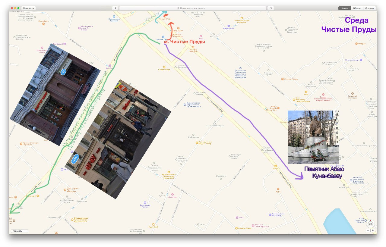 1. Среда: Cт. метро Чистые пруды, памятник Абаю Кунанбаеву, с 18:00. Выходишь из метро (выход №2) в сторону памятника Грибоедову (мимо трамвайных путей), Идёшь прямо по аллее, мимо туалетов, проходишь дальше, Видишь белый памятник Абая, справа от него на лавках компания. Координаты лавки: 55.762424, 37.643329 https://goo.gl/maps/Gp6C95Zjko72 Сходка каждую среду, без отмен. 10-25 человек.