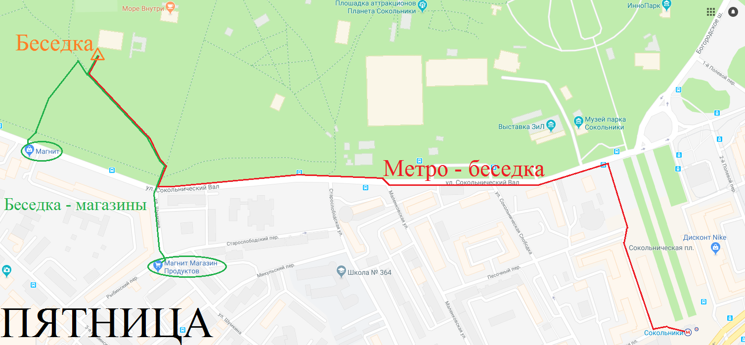 2. Пятница: Ст. метро Сокольники, беседка в парке Сокольники. С 18-19 часов. Выход из метро №1, прямо до небольшого ТЦ, Поворачиваешь перед ним направо и идешь вдоль, мимо церкви до улицы с автобусными остановками, После поворачиваем на этой улице налево, идем прямо около 800м, на втором светофоре по пути следования поворачиваем направо, в парк, Там сразу сворачиваем плавно налево(не резкий поворот) идем прямо около 200м и там уже будет видно беседку по правую руку, подходим к ней по тропинке. Координаты беседки: 55.793419, 37.663509 https://goo.gl/maps/WCe9w7wZ6WL2 Сходка по-договоренности каждую пятницу чекай конфу/тред, 5-15 человек.