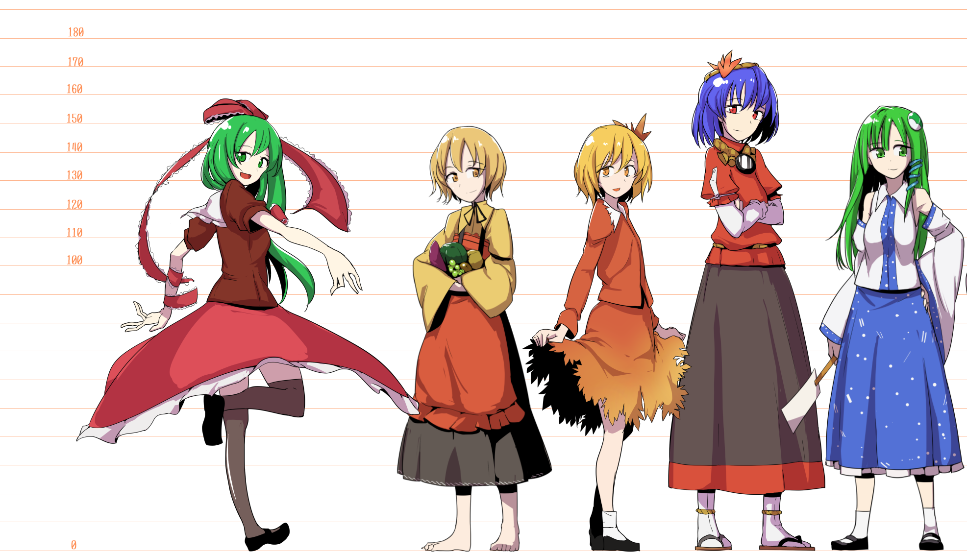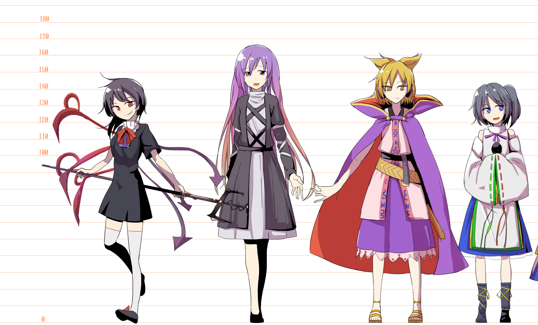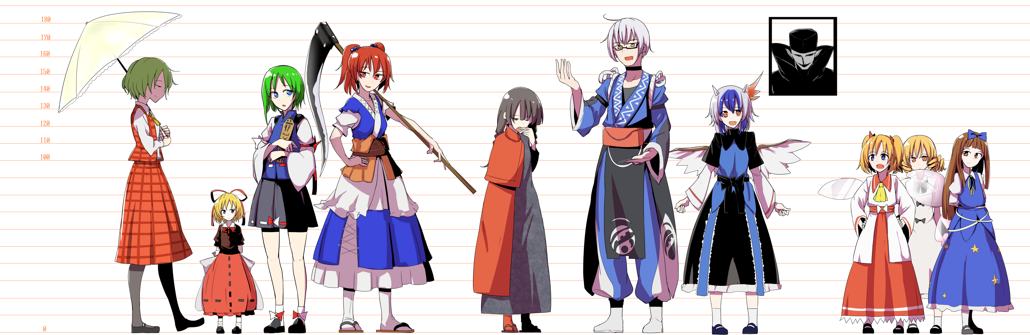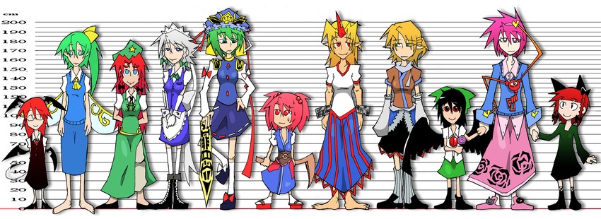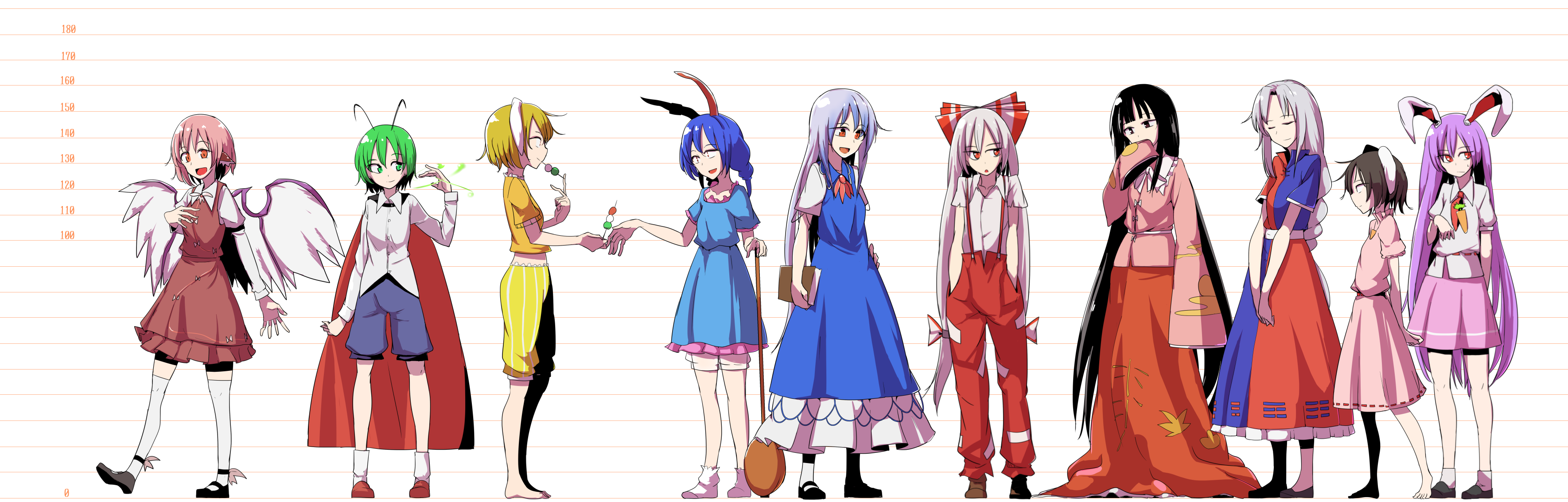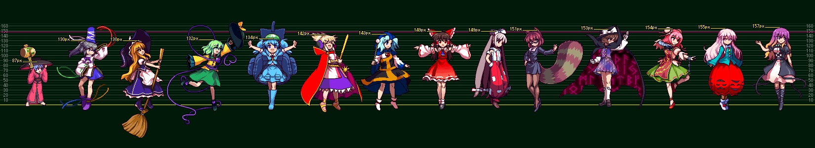 Так все-таки насколько они высокие? Есть ли какие-нибудь цифры по этому поводу? Ну или какими их представлял себе Зун? Или он определял их по категориям "повыше Рейму", "как у Рейму", "чуть пониже Рейму", "loli size". Или тут все так же расплывчато как и с размером груди? Можно ли считать, что рост у Рейму, Марисы и Санаэ примерно как у обычных японских старшеклассниц? Тогда что с остальными? Среди них ведь очень много екаев, причем довольно разнообразных. Что можно сказать про тех, кто "екай потому-что екай", вроде Юкари или Юки? Можно ли сравнивать рост по тому, как их изобразили в манге или файтингах? Знаете, мангаки иногда выкладывают картинки, где изображают в ряд своих персонажей, указывая их рост и вес (вроде пикрилейтед). Теги нашел height_chart и height_comparison (может еще есть). Хотелось бы увидеть что-нибудь подобное, одобренное Зуном.