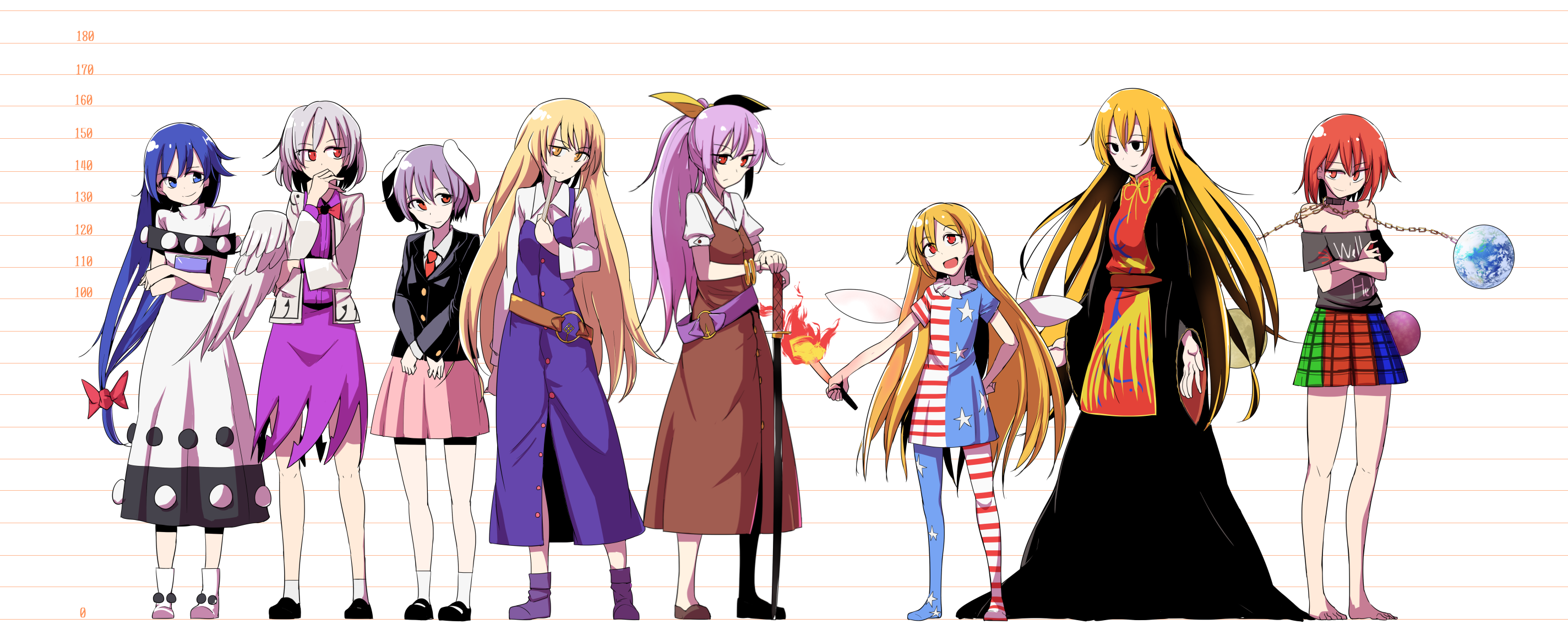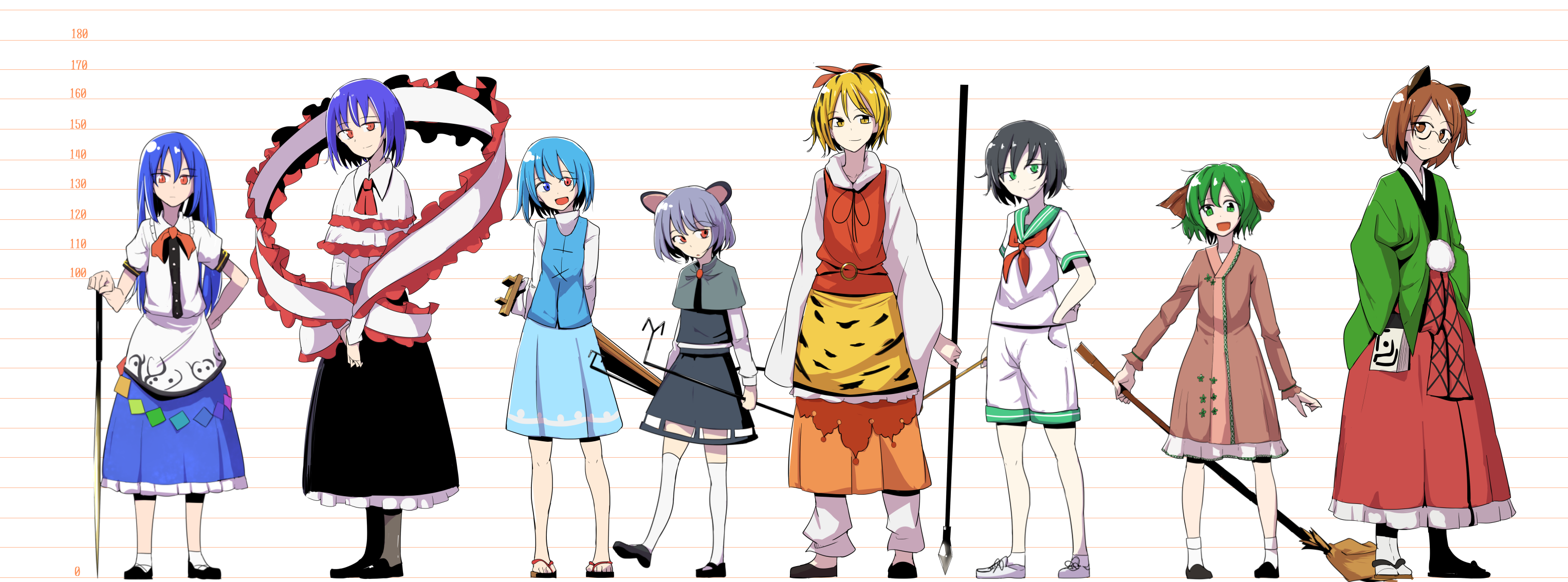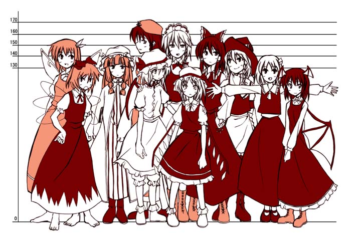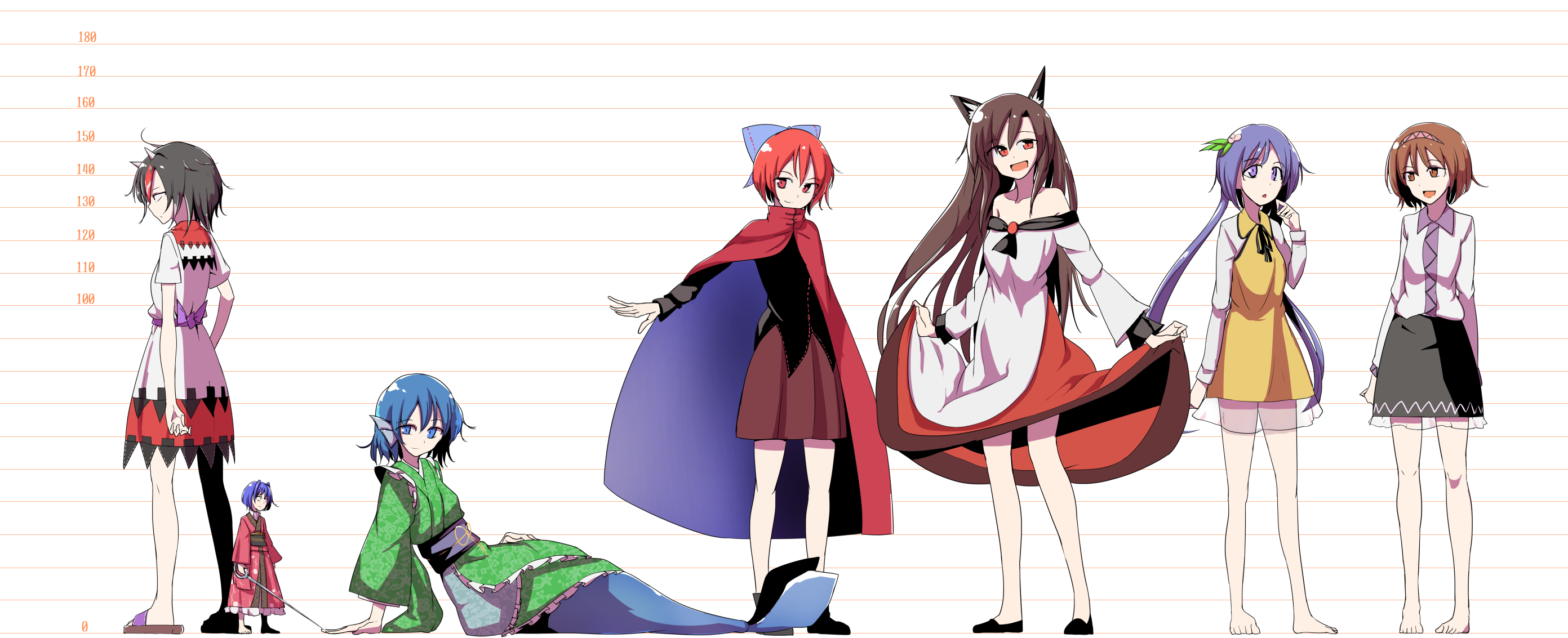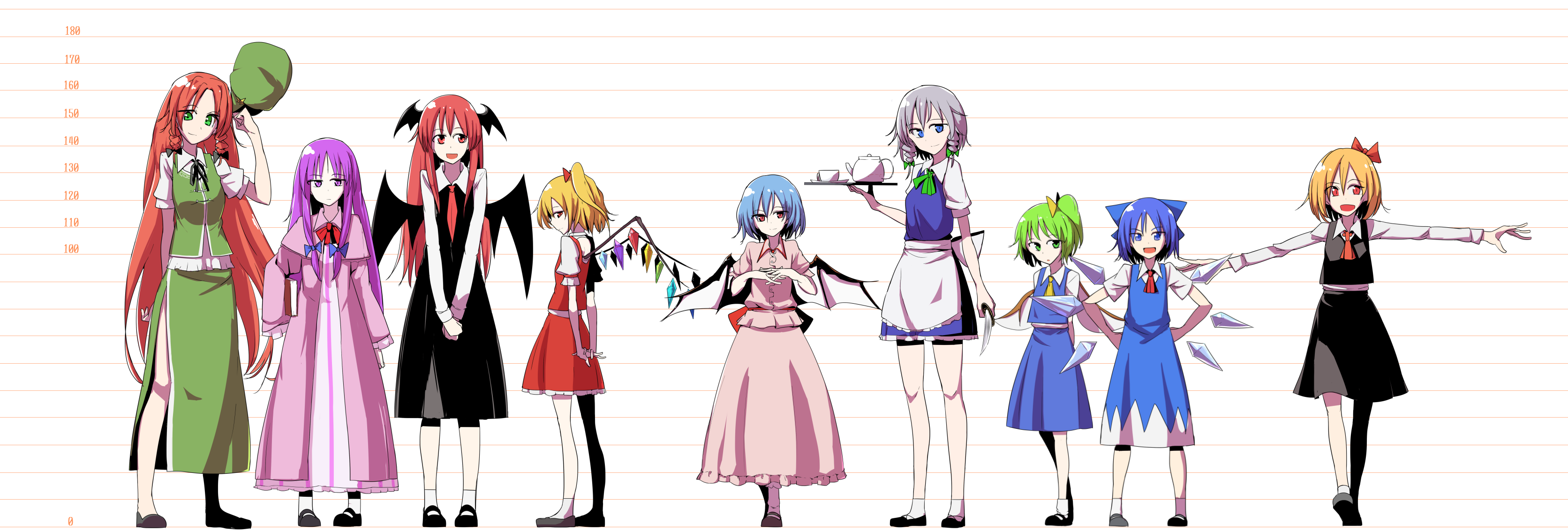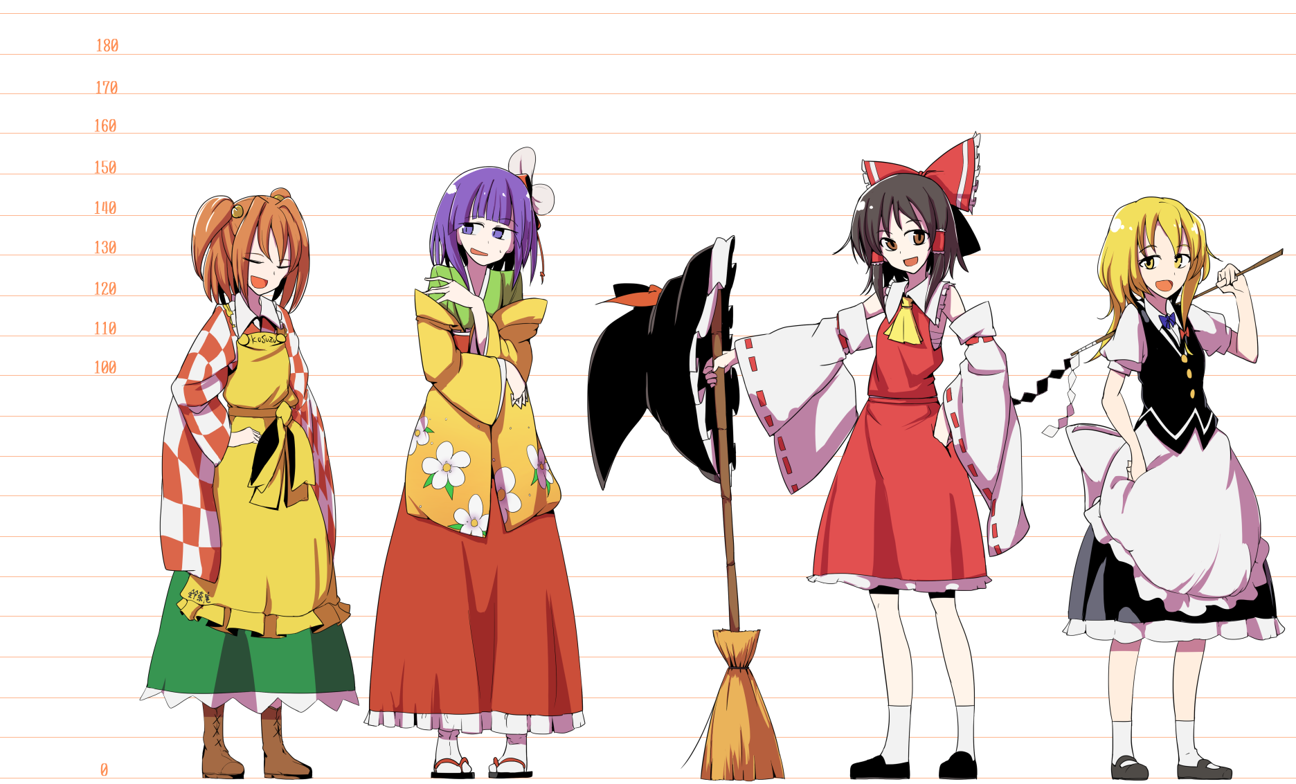 Так все-таки насколько они высокие? Есть ли какие-нибудь цифры по этому поводу? Ну или какими их представлял себе Зун? Или он определял их по категориям "повыше Рейму", "как у Рейму", "чуть пониже Рейму", "loli size". Или тут все так же расплывчато как и с размером груди? Можно ли считать, что рост у Рейму, Марисы и Санаэ примерно как у обычных японских старшеклассниц? Тогда что с остальными? Среди них ведь очень много екаев, причем довольно разнообразных. Что можно сказать про тех, кто "екай потому-что екай", вроде Юкари или Юки? Можно ли сравнивать рост по тому, как их изобразили в манге или файтингах? Знаете, мангаки иногда выкладывают картинки, где изображают в ряд своих персонажей, указывая их рост и вес (вроде пикрилейтед). Теги нашел height_chart и height_comparison (может еще есть). Хотелось бы увидеть что-нибудь подобное, одобренное Зуном.