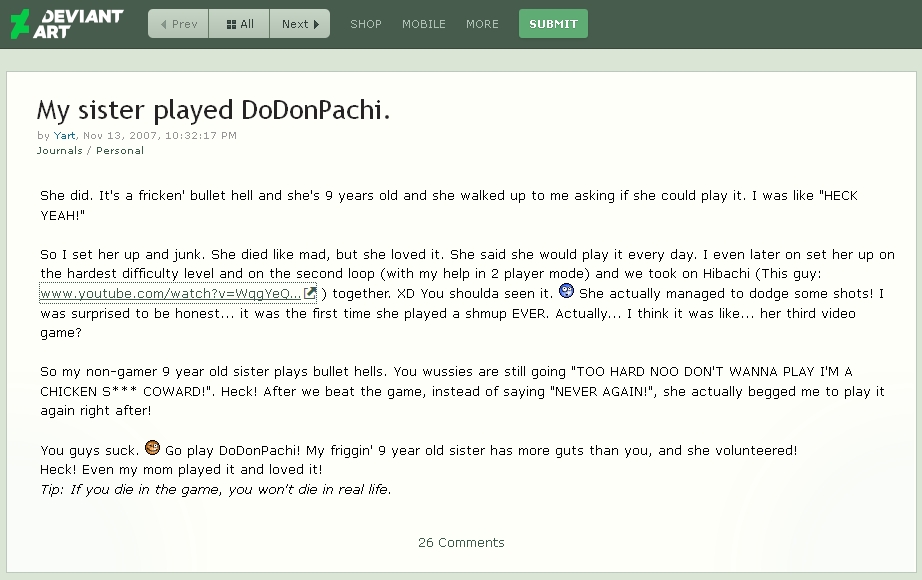 >>43037 >https://www.youtube.com/watch?v=vHbSNvcXz14 Какая мерзость. Может быть меня сейчас погонят тряпками, погруженными в известную субстанцию, но как же это отвратительно. Слишком как-то все некрасиво и негармонично -- от музыки до спрайтов. Ну и сами данмаку. Может я зажрался, но говно какое-то остальное тоже больно смотреть Вот то ли дело в Тохо, фанатских Тохо и изредка в фанатских скриптах на Данмакуфу -- может проседать музыка, но спеллкарты хотя бы не скучно-занудные. хотя на данмакуфу просто дохера невероятно убогих скриптов