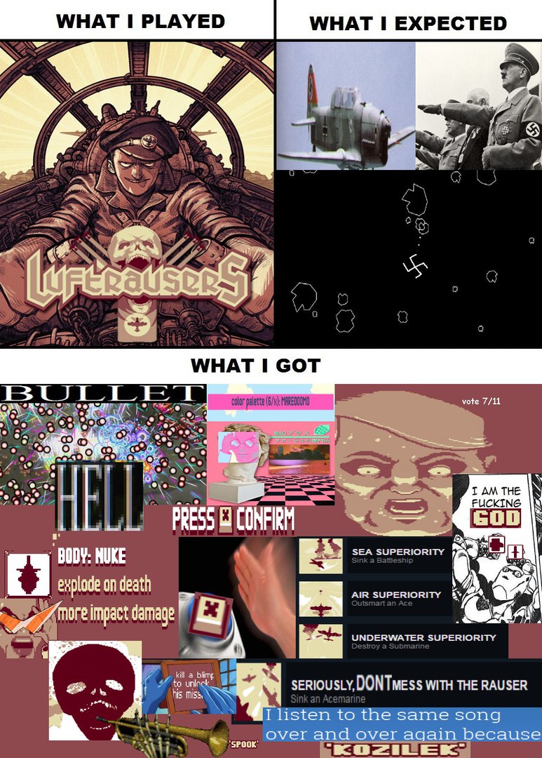 ТЫ СУПЕРПИЛОТ @ ЧТОБЫ СТАТЬ ИМ, ТЫ ОТМОТАЛ СЕМЬ ЛЕТ ТРЕНИРОВОК, В КОТОРЫХ ТЫ СОТНЯМИ УБИВАЛ СОБСТВЕННЫХ СОСЛУЖИВЦЕВ (УЖЕ ДОСТАТОЧНО, ЧТОБЫ ЧУВСТВОВАТЬ СЕБЯ ГЕРОЕМ) @ ТРЕВОГА, НА ЗЕМЛЮ НАПАЛИ ИНОПЛАНЕТЯНЕ! @ ВЫЛЕТЕЛ НА ВОЙНУ, ВСЕХ ПОУБИВАЛ @ ПОЗДРАВЛЯЮ С УСПЕШНЫМ ЗАВЕРШЕНИЕМ МИССИИ... ЕБАТЬ ТЫ ЛОХ! НЕ БЫЛО НИКАКОГО ВТОРЖЕНИЯ ИНОПЛАНЕТЯН, ВСЁ ЭТО ВРЕМЯ ТЫ УБИВАЛ СОБСТВЕННЫХ СОСЛУЖИВЦЕВ, КОТОРЫЕ ХОТЕЛИ ОСТАНОВИТЬ УСТРОЕННУЮ МНОЙ БЕССМЫСЛЕННУЮ ВОЙНУ! @ НУ ЧТО, ЧУВСТВУЕШЬ СЕБЯ ГЕРОЕМ? @ А СЕЙЧАС Я И ОТ ТЕБЯ ИЗБАВЛЮСЬ! ШИНУ ГА ЙОЙ! @ ВЫЛЕТЕЛ И ПОУБИВАЛ ВСЕХ ПО ВТОРОМУ КРУГУ, НА ЭТОТ РАЗ - ВО ГЛАВЕ СО СВОИМ КОМАНДИРОМ, КОТОРЫЙ ВСЁ ЭТО ЗАТЕЯЛ ИНТЕРЕСНО, ПОЧЕМУ ЕГО ЗВАНИЕ - ВСЕГО ЛИШЬ ПОЛКОВНИК? @ ВНЕЗАПНО, РАЗРУШИТЕЛЬНАЯ ВОЙНА, ОБРАТИВШАЯ ЦЕЛЫЕ ГОРОДА В РАДИОАКТИВНЫЙ ПЕПЕЛ, БЫЛА ДЛЯ ЧЕЛОВЕЧЕСТВА БЛАГОМ! ОНА РЕШИТЕЛЬНО РЕШИЛА ТАКИЕ ПРОБЛЕМЫ, КАК ПЕРЕНАСЕЛЕНИЕ, ЗАГРЯЗНЕНИЕ ОКРУЖАЮЩЕЙ СРЕДЫ И ГОНКА ВООРУЖЕНИЙ! @ А ЧТО, ЕСЛИ ОН БЫЛ НЕ ЗЛОДЕЕМ? ЧТО, ЕСЛИ ОН БЫЛ БЛАГОДЕТЕЛЕМ И ХОТЕЛ ПОМОЧЬ ЧЕЛОВЕЧЕСТВУ, ПРОСТО ТЫ ЕГО НЕ ПОНЯЛ? @ НУ ЧТО, ЧУВСТВУЕШЬ СЕБЯ ГЕРОЕМ? @ СЮЖЕТ ВСЕРЬЁЗ СЧИТАЮТ ГОДНЫМ