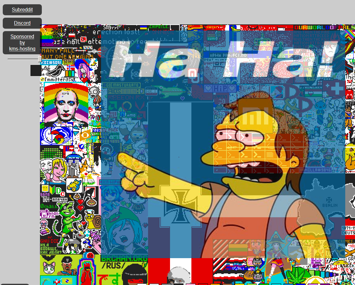 >>48052 > Ну, я думаю, вот на которой позиции картинка в ссылке сейчас стоит, на ней прямо и начать? Только на 1000 пикселей вниз сдвинуть на новом холсте и все. Ну, наверное можно и так. Если там флага по соседству не будет, конечно. Судя по их дискорду ресет у них готов, но лежит сервак, а наши оранжевые соседи дружно ддосят сайт.. Я конечно не намекаю, но всё-же. Блять, вот же медлительные какие, я итак не сплю нихуя, а сегодня вообще 3 с половиной часа максимум просплю.
