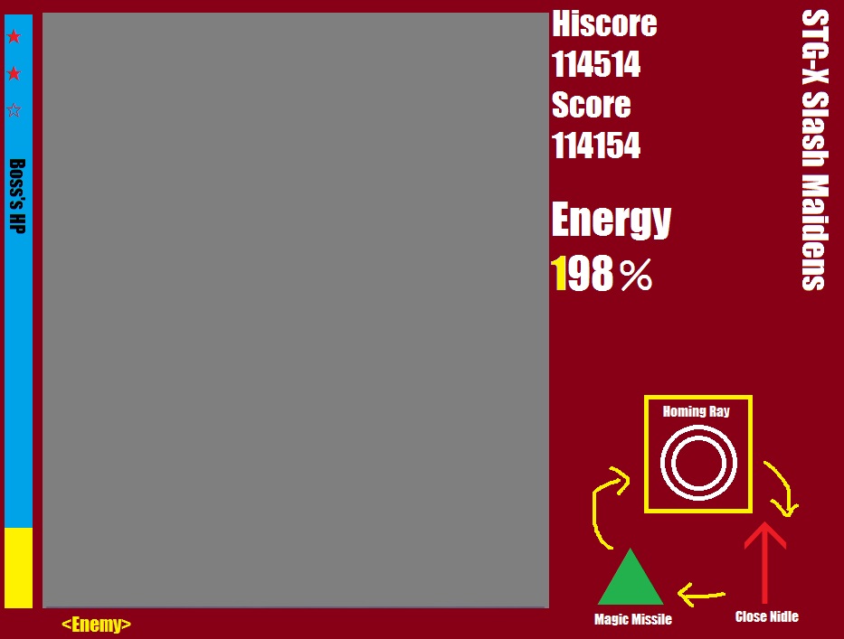 В данный момент мы разрабатываем кое-какие RPG-игры, используя RPG Maker, однако мы также обдумываем идеи для новой не-RPG-игры. Концепт новой игры – 2D-шутер в стиле Touhou, а ее временное название – «STG(Shooting Game)-X Slash Maidens». Эта игра имеет уникальную функцию, которой нет в Touhou: игрок может менять оружие во время игры. «Homing Ray» автоматически преследует врагов, так что вам не нужно находиться перед врагом, однако он наносит самый слабый урон. Урон от «Close Needle» тем выше, чем ближе игрок находится к врагу. «Magic Missile» медленно летит по прямой, узкой траектории, однако наносит самый большой урон.