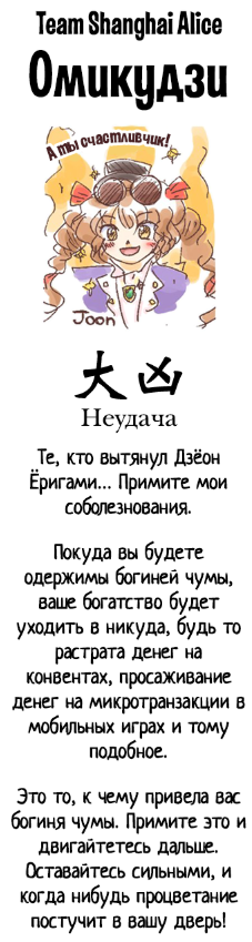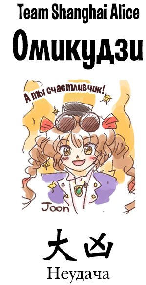Вот чё нарыл с предидущих Тохо-сборищ: 1 пикча - какая у Маленькой Дьяволицы ляжка. Мясистая. 2 и 3 пикчи - Это называется "Кавайная Итася". Состоит из двух слов: Итай и машина. Увидеть бы это чудо на Невском проспекте и реакцию ментов. Да уж. 4 пикча - Это чувак из Тохо-видюшек с мешком и иероглифом. Видимо, он олицетворяет анонимуса в Генсокё.