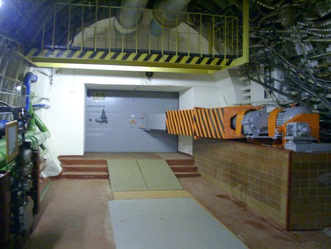 ... В конце коридора указатели объясняют, что прямо - вход NA, а в левом ответвлении - вход NB. До занимающей пол-тоннеля двери, запирающей вход NB метров двадцать от развилки. Здесь очень забавно. Во-первых у самой двери (небесно-голубого цвета !) расположен пульт управления гидроприводом с опечатанными тумблерами. Причем взять на себя управление может только человек, имеющий некий КЛЮЧ. Всего ключей ДВА: один торчит запломбированный в пульте, а второй - ?. Все лампочки погашены, хотя некоторые тумблеры включены. Тоннель здесь не отделан, обвешан кабелями и разделен продольной стенкой на две равные доли. Левая заканчивается описанной дверью, а правая представляет собой серию дегазационных камер с окошками (их около шести), в которых по-видимому в случае химического или радиационного загрязнения отмываются люди, спустившиеся с поверхности. Все камеры снабжены гермодверями, а крайняя имеет выход в главный коридор (в окошко видно, что в ней обыкновенный душ)...