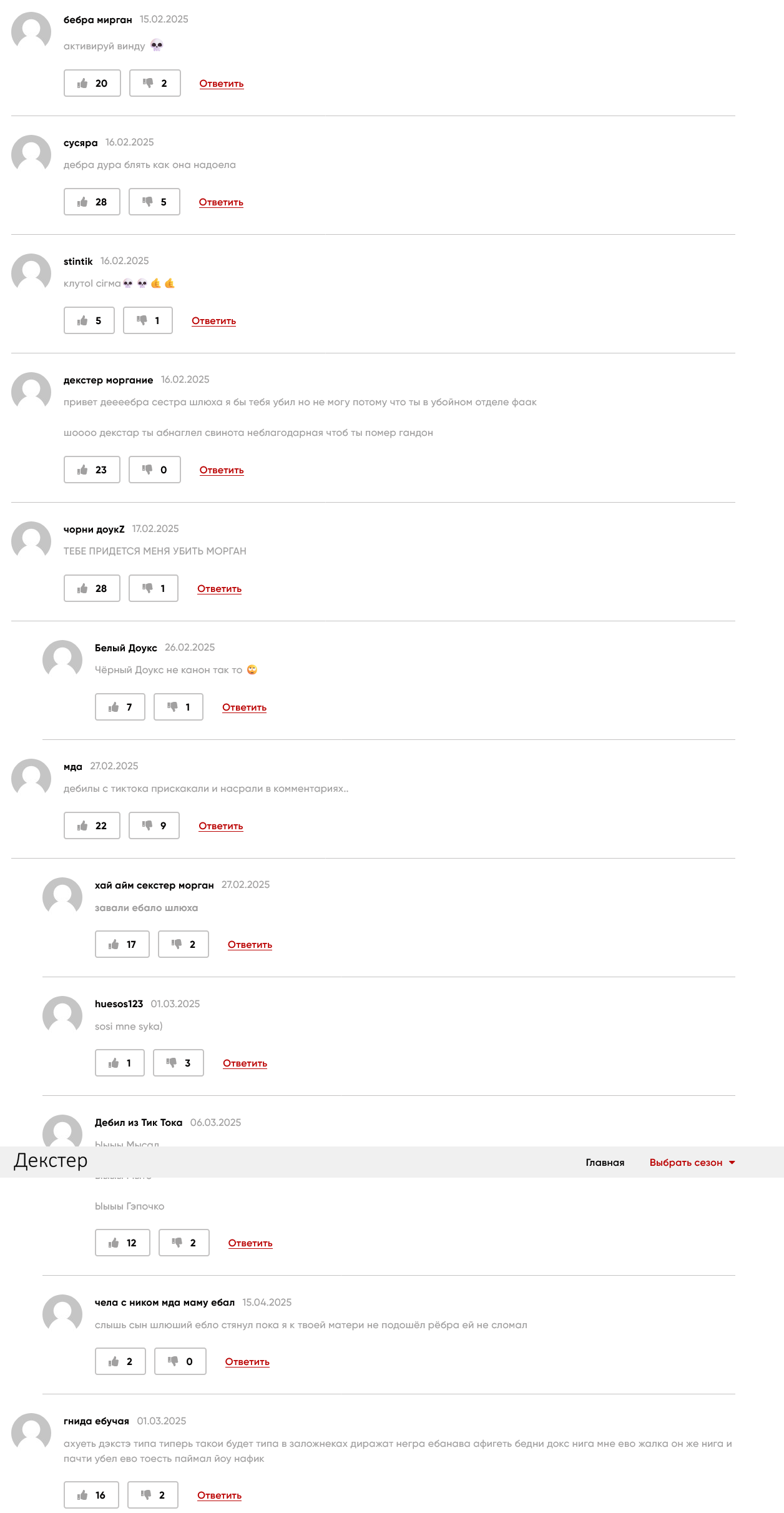 Уже десятый сезон, а Декстер как персонаж почти не развился и до сих пор рефлексирует и ноет про своего попутчика и т.д, даже будучи дедом. Как же это надоело уже, ну было же развитие после четвертого сезона до финала. Персонаж более менее нашел себя и уверенно жил, но вот уже второй сезон продолжений он находится на уровне концовка четвертого сезона. Вся драма его душевных терзаний уже исследована вдоль и в поперёк. ИМХО Декстера тащили сюжет двойной жизни, с ситуациями напряженными когда эти жизни пересекались и одиночные мисси Декстера+ситуации когда он помогал людям. Вся эта срань с сыном, что когда он младенцем был, что тем более взрослым, худшая арка сериала. Надеюсь в конце этого сезона он ебнeт душегуба сыночка и в свободной плавание на несколько сезонов уйдет, мочить маньяков с постоянными копами на хвосте или типа того.