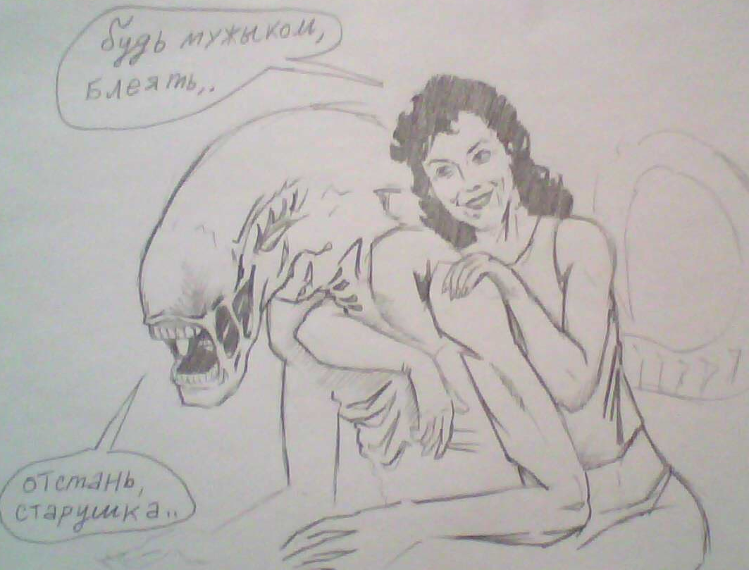 Так ты не путай, что это не человек кусает, это инопланетный глаз, овладевший телом человека, кусает ксеноморфа