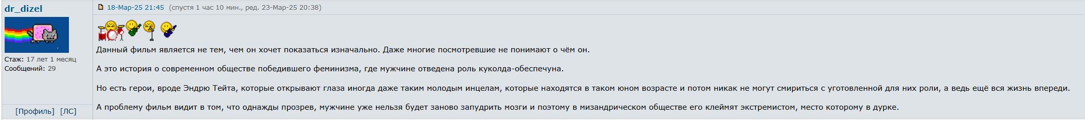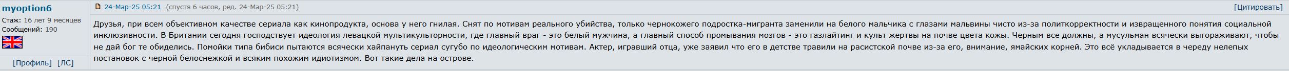 Как же Нетфликс успешно продает что угодно, а люди хавают... Если что, то сериал норм, но на британском тв полно подобного и на абсолютно эти же темы, но тут в продюсерах оказался "некто" и внезапно на сериал всем не пофиг. Бабки на маркетинг просто большие потратили и все покорно пошли смотреть. Сериал реально обычный. При всем моем уважении к Стивену Грему, прекрасный актер, но сериал смотреть было скучно и некоторые моменты выглядят нереалистично. Самое печальное, что многие реально решили, что сериал про инцельство, соцсети и маносферу и с этим нужно бороться. Даже премьер Британии вышел и сказал, что после сериала займется воспитанием подрастающих мужчин... "Осознанные" родители, вон, заставляют своих 13-летних детей смотреть (я не шучу) с ними этит сериал, как будто инцел, посмотрев сериал, одумается резко...идиоты. В общем, посыл сериала в том, что нельзя класть болт на своих детей. И не важно, какое там новое движение в сети и что популярно у молодежи (такие дети были и до появления интернета). Родители должны интересоваться жизнью ребенка, общаться с ним на интересные ему темы и заниматься воспитанием, а не считать, что за них это сделает школа или кто-то еще. Инцельство - это не причина, а следствие.