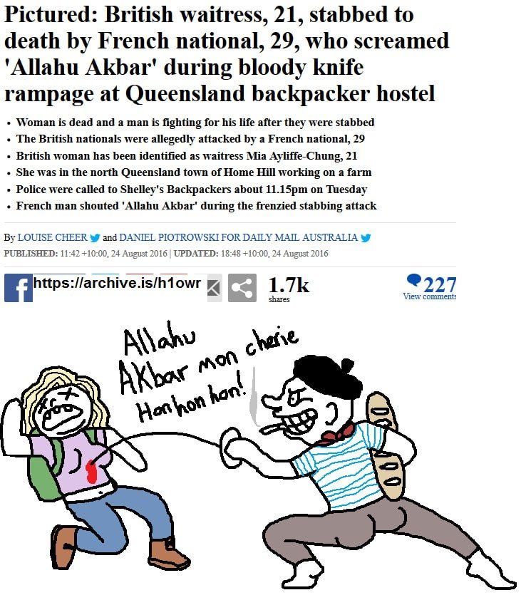 >>3364866 Но тот чувак типа пишет, что все поехавшие это инцелы одиночки, так что не особо важно сам убил или нет. Он создал культ ведущий к насилию. Как, например, Сёко Асахара. Так что его теория нихуя не верна. Не говоря уже о том, что в европе ножом режут не инцелы как раз, а агрессивные макаки мигранты. Но это неудобная тема, проще на инцелах отыгрываться.