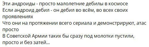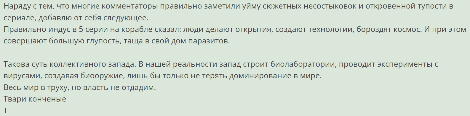 В сериале 0 атмосферы и 0 напряжения и ощущения угрозы. Людишки либо болванчики расходные, на которых тупо похуй. Либо это синты-андроиды, хуеиды, которые ничего не боятся.