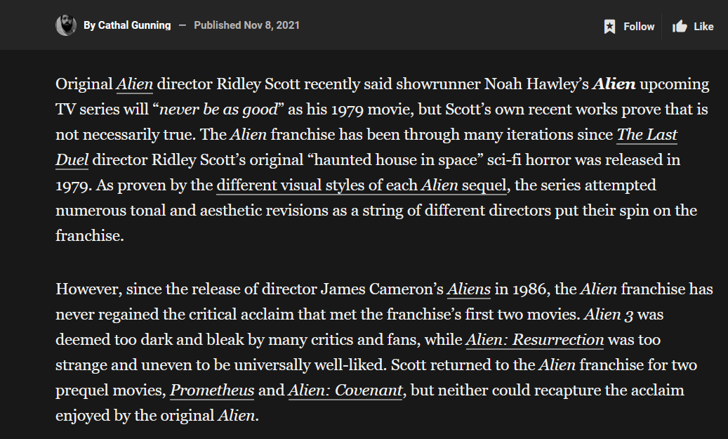 Я пока первую серию только посмотрел. В общем-то неблохо, картинка приятная, всё довольно дорохо сделано, даже масштаб присутствует. Но сука как же бесит скорость происходящего. Что в Ромуле чужик вылуплялся из живота спустя 10 минут, тут клещ какой-то надувается за пару секунд. Блять, какая же хуйня! Но это так доёб по мелочи. В целом 1 серия 6/10, пойдет.