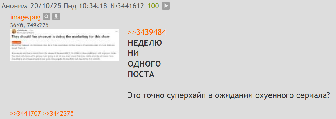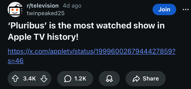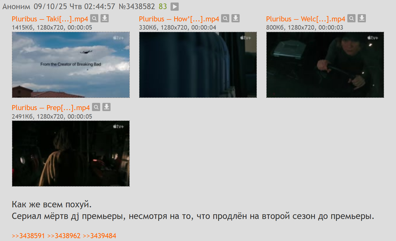 Тут и 5% годноты нет, что выходило за последнее время. Плюрибус - единственный сериал из достойных, тред которого живой и здоровый. И только из форса. Если бы не Эппл и не Гиллиган никто бы даже и тред не создал.