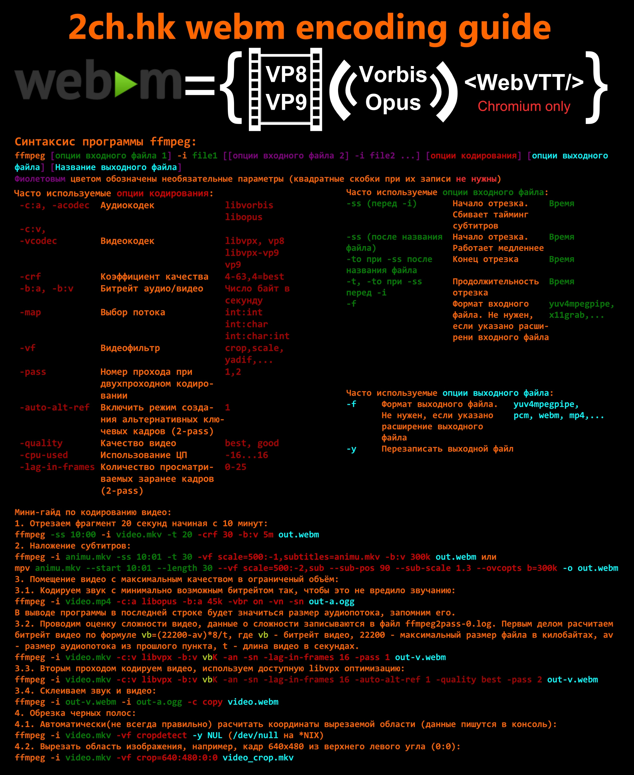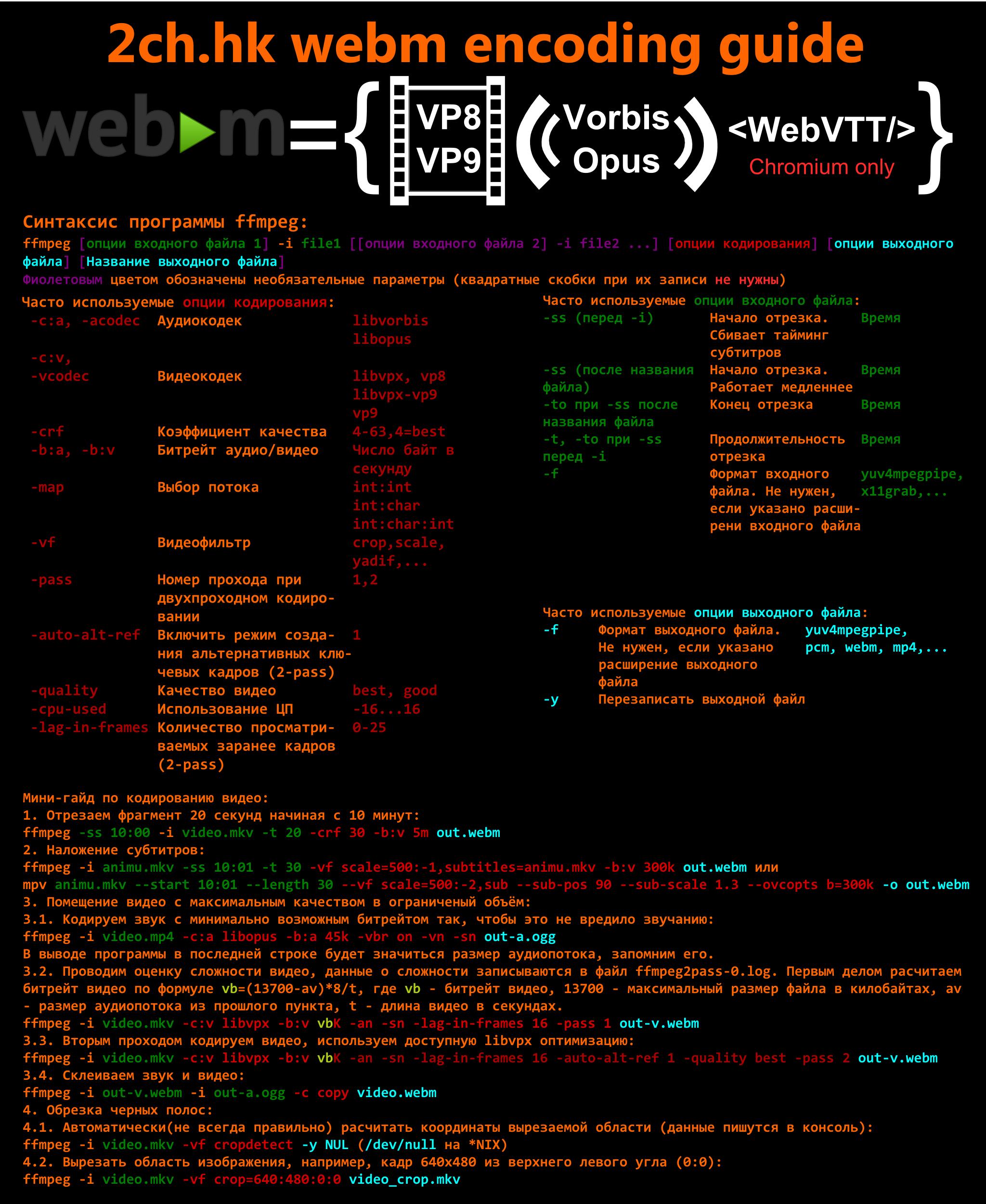 >Делать WebM можно научиться в вики треда: https://github.com/pituz/webm-thread/wiki/ >Там находится подробная информация о выборе и настройке кодеков на примерах использования консольных утилит ffmpeg, vpxenc и mkvmerge.