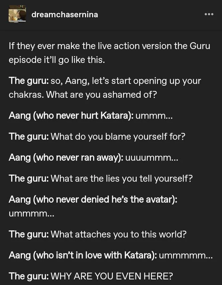 Команда Аанга повзрослела за время сериала. Каждый из них справлялся со своими комплексами. Что произошло в последующие годы? Почему они деграднули? Потому что сценаристы не справились со своей задачей.