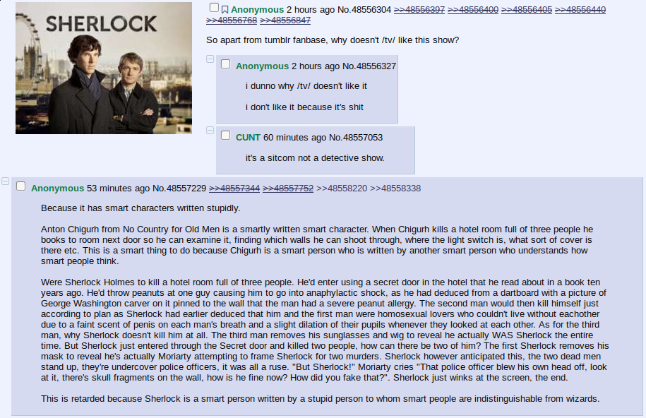 >>3326662 >1 - гуд омен Как-то маловато оказалось. Были моменты,которые мне понравились. Но и эта пратчетовская или гарисоновская саркатистическая манера повествования пиздец бесит. Всякие кингс баунти(игры) из такой серии. Бесит пиздец. Ненавижу!!! Но там 1 сезон, так что можно и не бомбить. >2 глухарь Не смотрел, но там ебучий аверин. А он пидр бесит, так что в печку! >3во все тяжкие Коллеги-пидорасы совратили меня на просмотр этой хуйни, комментируя это поделие "лучший сериал в истории, таам такое!!!! " Я смотрел и ждал, когда же начнется это самое. Но нихуя! Ужасно нудная хуйня, бесячие персонажи, особенно ебучий джесси, пздц, ни с одним пкрсонажем связи не выстроилось. Даже скорее мексикос-бандос-убийца каких-то баллов у меня в душе получил, чем все остальные. >4 доктор хаус Вот эта залупа людей с ума сводила пздц. Все ходили и трындели, что все лгут и какой хаус мега мозг и вообще какой это лучший сериал и как там все круто. Посмотрел я то ли сезон, то ли два - буквально 40 одинаковых серий как под копирку про поиск болезни. И каждый раз какая-то НЕХ. Короче бесячая история. Абсолютно бездушная хуйня, где менеджеры замутили простенькую формулу про хама-врача-гения и доили ее хз сколько. Лютый гойский лохотрон. Физически тошнило от просмотра. Такое ощущение, что Лори к 50ти годам продался в анальное рабство и начал играть за деньги уебков и множить зло в этом мире. Абсолютно проклято!