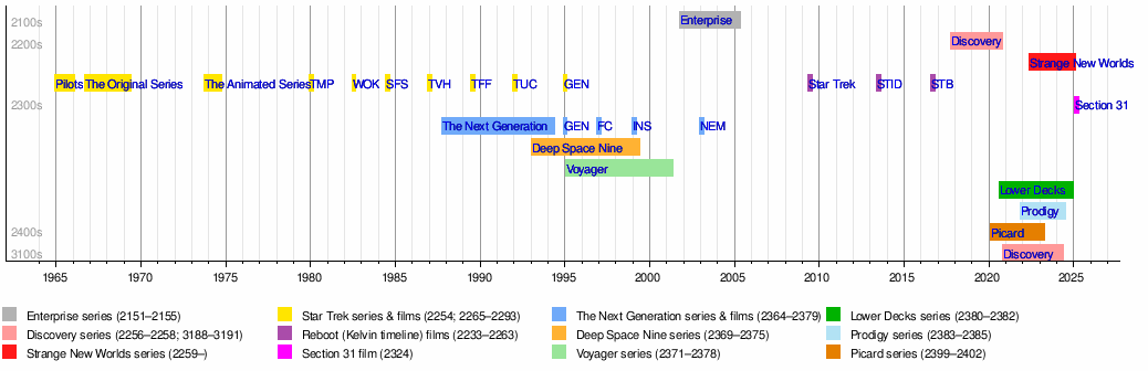 Хронология: 2151-2161: Star Trek: Enterprise (эфир с 2001 до 2005) 2255-2265: Star Trek: Strange New Worlds (с 2021) 2255: Star Trek Discovery (первые 2 сезона) (2017) 2265-2269: Star Trek: The Original Series (эфир 1966-1969) 2269-2270: Star Trek: The Animated Series (эфир 1973-1974) 2273-2293: Original Star Trek movies (в прокате 1979-1991) 2300: Star Trek: Section 31 (2025) 2364-2370: Star Trek: The Next Generation (эфир 1987-1994) 2293-2379: Next Generation Movies (в прокате 1994-2002) 2369-2375: Star Trek: Deep Space Nine (эфир 1993-1999) 2371-2378: Star Trek: Voyager (1995-2001) 2380-2383: Star Trek: Lower Decks (2021-2024) 2383: Star Trek: Prodigy (2021-2024) 2399-2401: Star Trek: Picard (2019-2023) 3188-3190: Star Trek Discovery (сезоны 3-5) (2021-2024)