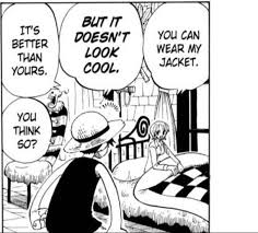 Я плохо помню, Нами же не участвовала в финальной битве Арлонг парка в оригинале? Эта сцена с шляпой мне виделась так: "Подержи моё певко шляпу, сейчас будет месиво, не хочу чтобы она испортилась." В лайве же Нами заваливается чистить ебасос Арлонгу вместе с Руфатом.