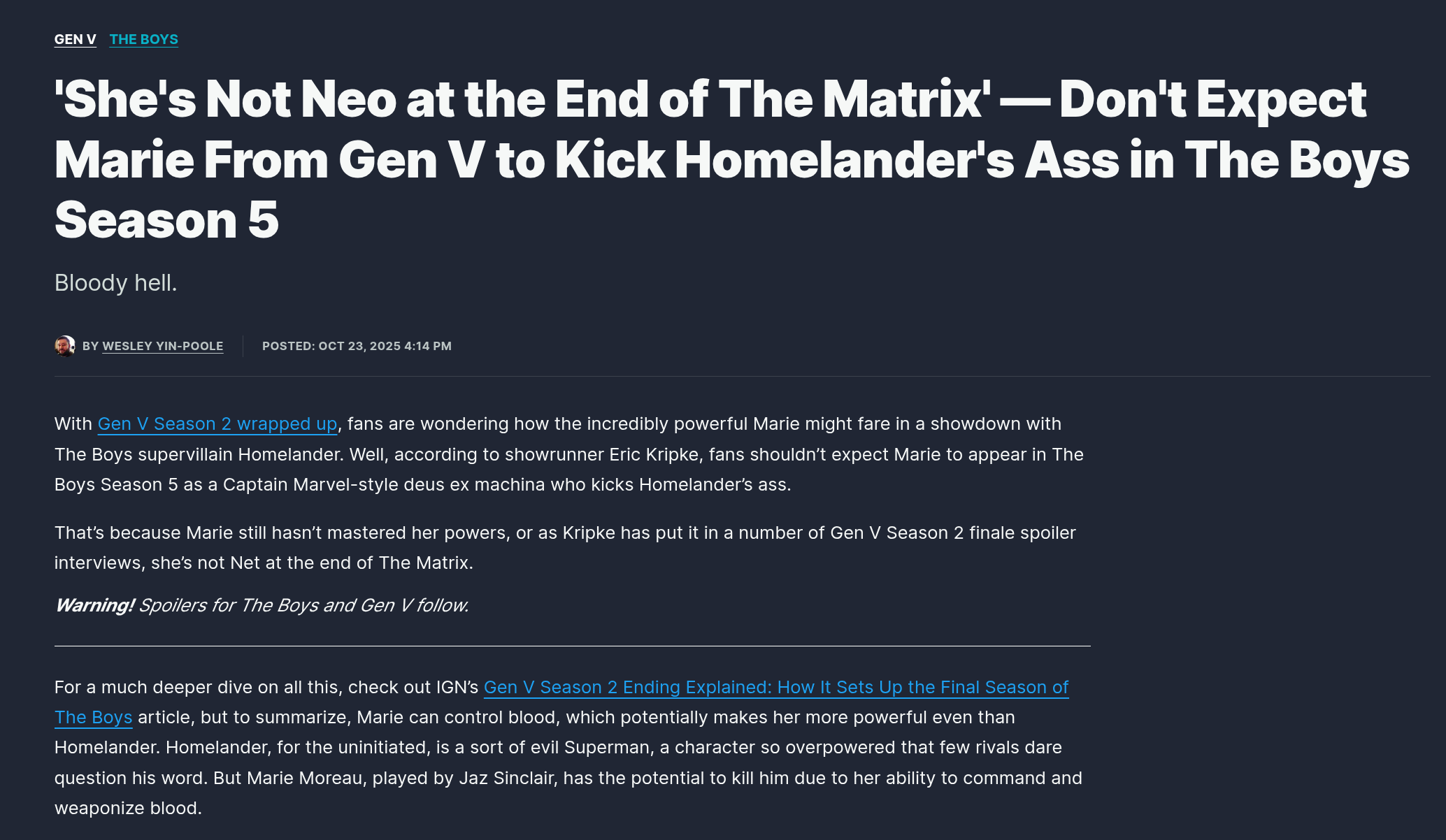 Пацаны 5 сезон, финал, в 26 году покажут, всей основной сюжетке там явно суждено завершится. А с этими что? Высосут из пальца очередного злодея и будут весь сезон письку мять, чтобы его победить?