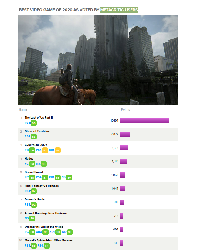 Из интересного, самые высокие оценки (выше 9 баллов) у эпизодов, которые либо расширяют недоработанные части игры (1 и 5 эпизоды для пролога и Питсбурга соответственно), либо напрямую показывает ее лучшую часть, как эпизод с зимой и каннибалами. Геи и лесбиянки зашли зрителям меньше всего - 8.1 и 7.3 балла соответственно.