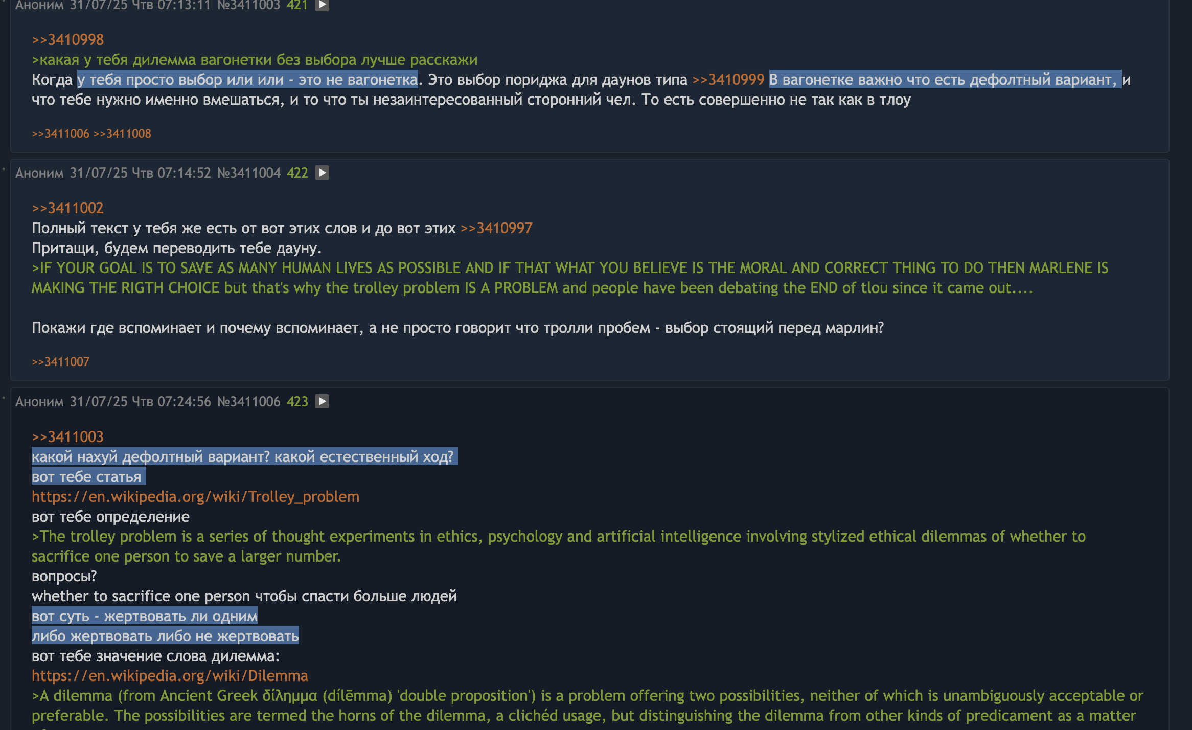 >>3413657 >дурачок, любой выводится в абсурд Нет далбаеб, попробуй вывести в абсурд утверждение "трава - зеленая". >не всегда нужно даже опровергать версию оппонента, потому что не всегда это автоматически делает тебя правым Если есть точка зрения "трава - зеленая", а далбаеб говорит что трава синяя, то если показать что хлорофилл поглощает синий цвет и выставить далбаеба далбаебом - то этого будет достаточно, чтоб победить в дискуссии. >ладно, давай и дальше каждый так считать Всем пох че ты там пукаешь после "ладно, давай", это очередной слив гуфикса. >дети не обречены от того что вакцины нет, у них есть хорошие шансы выжить Следующие зараженные кордицепсом дети обречены. Это Марлин их обрекла бы на смерть, если бы отказалась от вакцины. >у нее так то дохуя выборов Есть только 2 варианта, продолжать создание вакцины или отменить ее. Других вариков нет. >нихуя она не обрекает опять же Отказываясь от создания вакцины, она обрекает на смерть всех следующих заразившихся. >она не подстроила этот апок, так что ее вины нет в том что кто-то заражается Если она знает что есть возможность сделать вакцину, и она отказывается от вакцины - то она обрекает на смерть своих следующих заразившихся друзей. Чел стоящий у рычага вагонетки тоже не строил эту железную дорогу и не раскладывал тела на рельсы, далбаеб. >>3413658 >это ее единственная аргументация, не существует слов от нее что у нее выбор убить элли и убить много Слова она говорит для Джоула. В диалоге с Джоулом. А по факту у нее только 2 варианта есть, либо продолжать вакцину, либо нет. >>3413659 >>Ей с неба упало право? >Ну да. Это так работает только в либеральных обществах, где людям с неба падают права, по их факту рождения. >>3413660 >Это когда стоит выбор скольких убить, то этичней убить меньше. Так это как раз тот случай. У Марлин выбор, обречь на смерть одну Элли или обречь на смерть дохуя следующихся заразившихся. И других вариков нет, далбаеб. >>3413662 Далбаеб спрашивали про оценку решения Марлин, а не оценку выбора гуфи между малиновым и клубничным пориджем, у которого есть поридж который можно выбрать и при этом никого не убивать. У Марлин такого варианта нет.