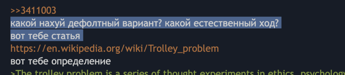 >>3439312 >надо быть чуть чуть развитее чем математика это чтоб в 10 попасть (сдается мне что там нитакусь которые нормально обосновали почему выбрали убить 5 гораздо меньше, большинство из этих 10% я подозреваю просто edgy)