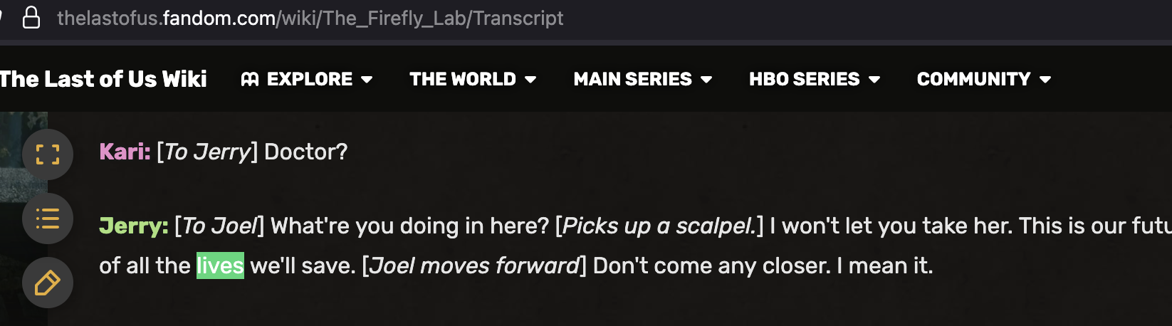 >>3413653 >она говорит - think of all the lives we could save Это ее аргументация к Джоелу. Пыталась далбаебу объяснить что миллионы жизней зараженных важнее чем жизнь офк одного. И типа не важно что эта девочка тебе напоминает свою дочку., типа подумой, сколько девочек можно пасти.