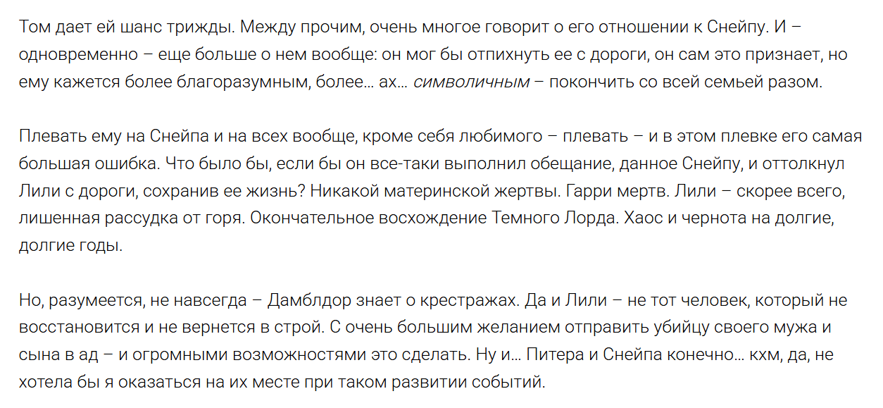 И возвращаясь к старине Тому, а точнее почему на сравнение его с Гитлером стоит посмотреть дальше, чем просто "злобный злюка". Гитлер, предоставляя элитам идею (чистоту крови) которая им льстит, но ставя эту идею выше них, неизбежно вступал с ними в конфликт на долгой дистанции, а вообще и в горячее противостояние. С Пожирателями же похожая история. Сам по себе Том наполовину чужак в их мире, но он, помыкая аристократией, ставит Магию выше них. Частично он и сам аристократ, частично маг, но именно мир волшебства он ставит в абсолют. И глядя на то, как истории написала Роулинг - вполне заслужено. В её же глазах мир маглов любить нельзя. И если подумать, то Гарри и компания просто отстояли социальные лифты в мир избранных для снежинок вроде Гермионы и Лили. Нет, я сам был очарован этим миром, но то, что я расписал, всегда отдавало странным чувством о том, что история вроде хочет подвести к морали, которая в своей сути спотыкается сама о себя. Ну, если не задумываться об этом, то моральная противоречивость даже добавляет изюминку. Ну, как и о многом в ГП лучше меньше задумываться, а больше прочувствовать.