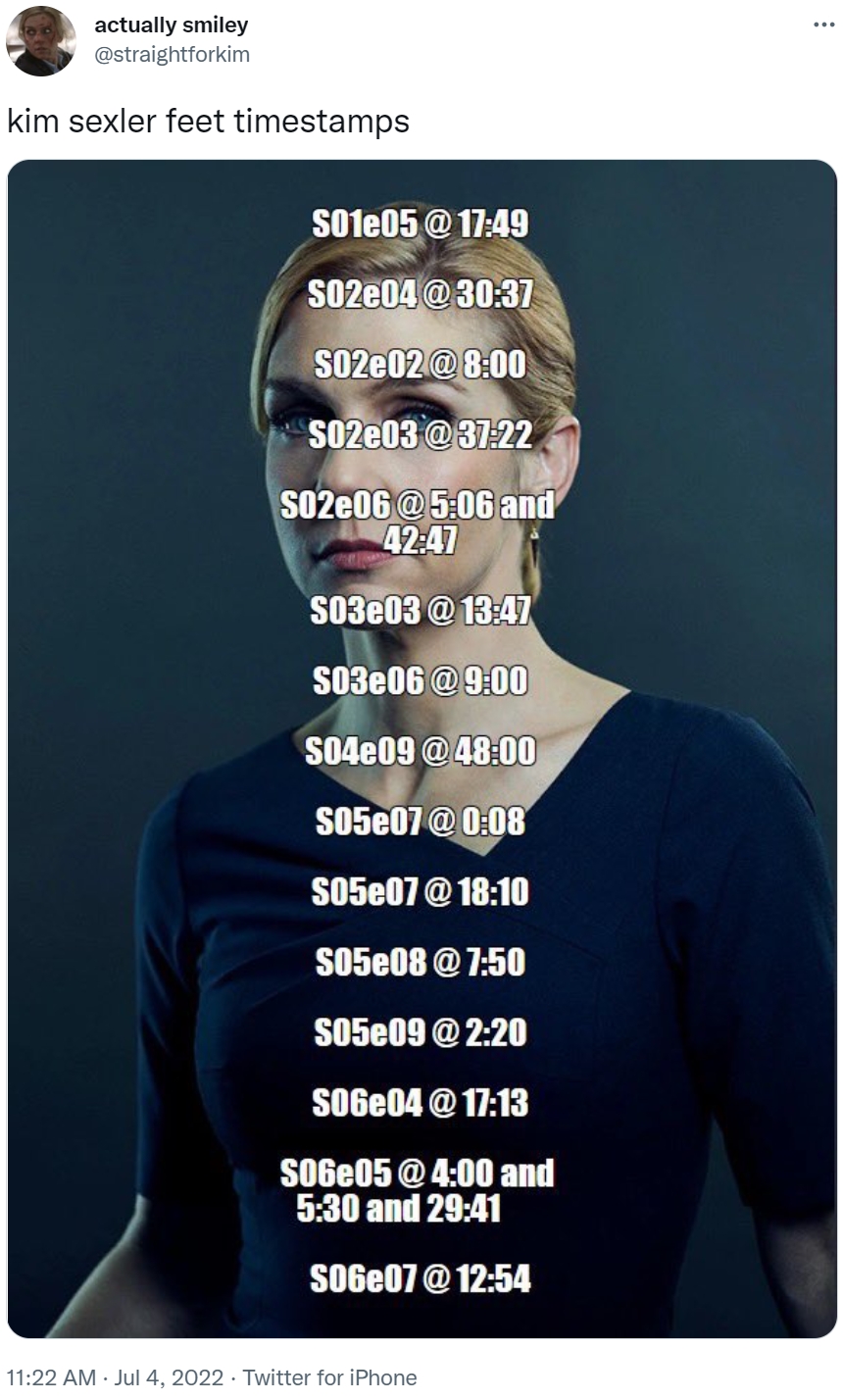 >>3426885 Да похуй. Главное чтобы Рея побольше ступни показывала, ведь вгиллиган знает толк и бисексуальный судя по всему, ведь Джимми, Лало и Говард тоже пихали свои босые лапти в камеру