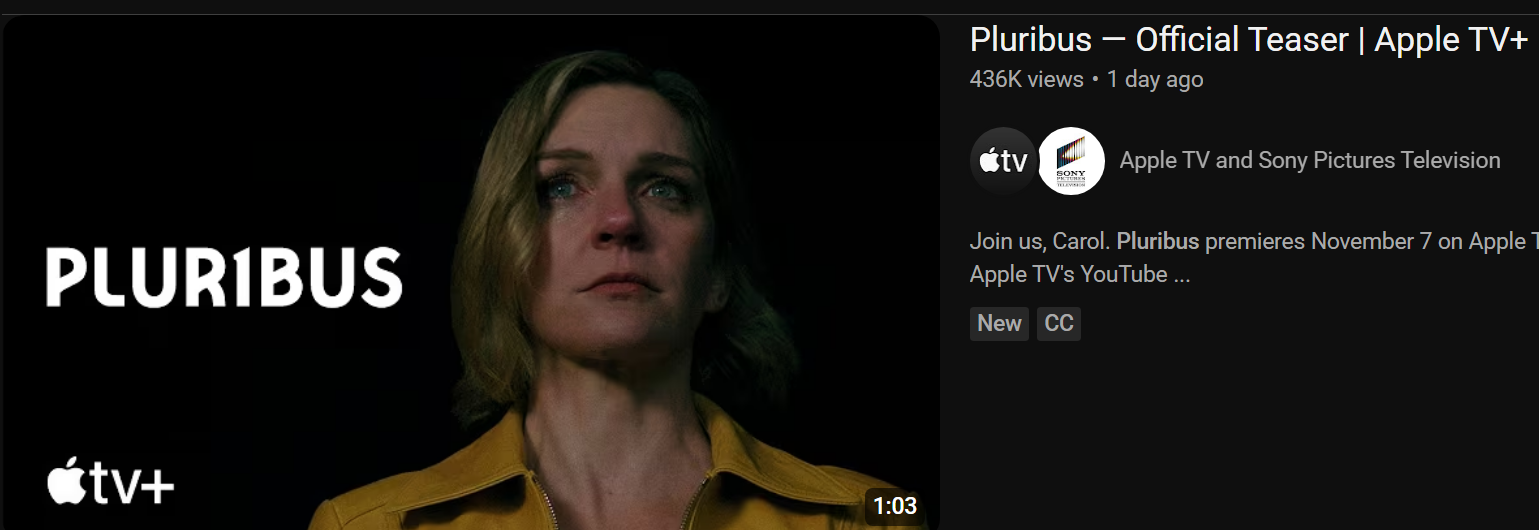 Посмотрел первые два эпизода «Лучше звоните Ким» (Pluribus). Хоть и вторичен сюжет про вторжение похитителей жоп, но мне понравилось, интригующе пока выглядит. Видно, что сделано чуваком, который раньше писал сценарии к «Секретным материалам».