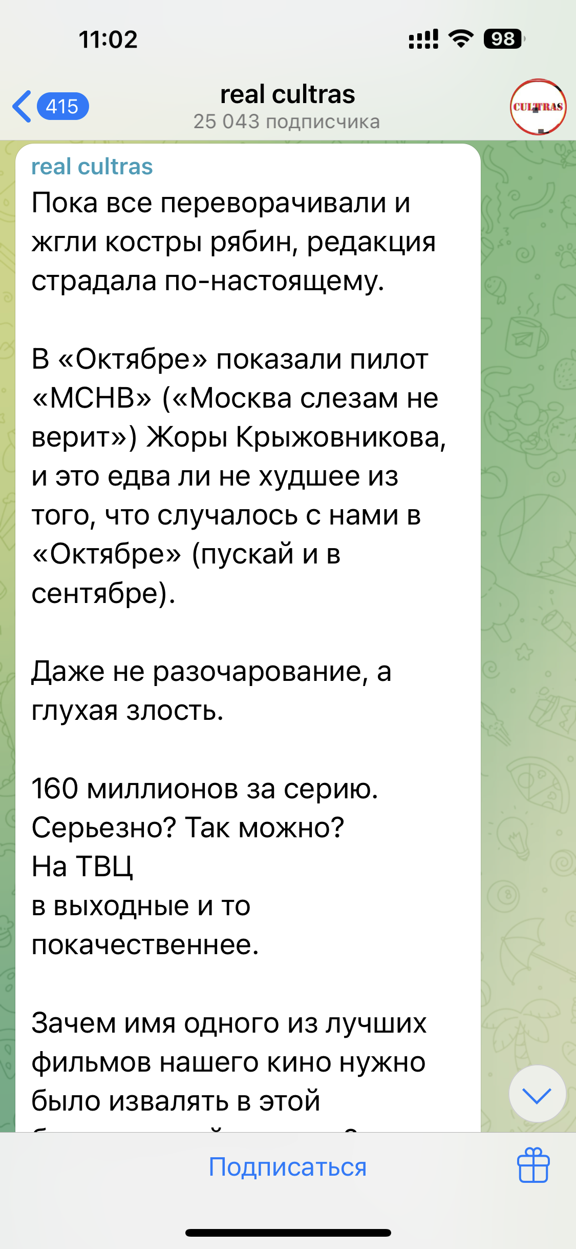 "Москва слезам не верит. Все только начинается". Wink. Посмотрев первую серию еще до премьерного показа, Шоу дал себе время. Время остыть. Велик был соблазн написать такого, что по кармическим законам вселенной может вернуться ему самому в утроенном размере. Выдохнув, можно сказать, что на лицо очередная попытка паразитирования на великом. Не первая и, к сожалению, не последняя. Чем жирнее имя и шире ЧСВ у автора, тем попытка эта каждый раз более провокационная и беспардонная. Жора Крыжовников мастерски наебал зрителя, всучив ему криво сшитую херню, где намешал "русский Ла-ла-ленд" и поверхностную слезливую промокашку про город, в котором не хочется жить. Сколько ты не заставляй Янковского танцевать на фоне Крымского моста. Потому что есть разница между вызовом судьбы и наигранной черствостью. Именно такая разница между испытаниями выпавшими на Муравьеву с Алентовой и тем, что Ксюша в юности (Стойкович) ворует еду в "Пятерочке". Несколько раз по телеге натыкались за последние дни на писк, что, мол, смотрите на это как на отдельное произведение. Но во-первых, нихуя. Смотрели бы как на отдельное произведение, если бы сериал назывался, условно "История трех баб". Хотели откуснуть от гениальности Меньшова - жуйте по полной. Во-вторых, как отдельное произведение это тоже полная шляпа с второсортными каверами советских песен и посредственными шутками. Вот собственно и весь наш сказ.