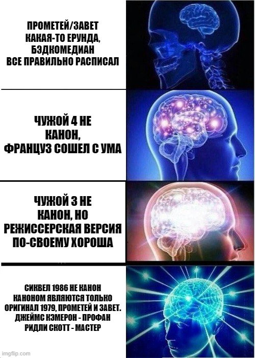 стоп, так не канон теперь Aliens, Alien 3 и Alien 4 Ressurection? Там везде королева чужих. Я понимаю почему Aliens не канон - этот высер и фильмом назвать сложно. Но 3 и 4, особенно 4 - отличные фильмы.