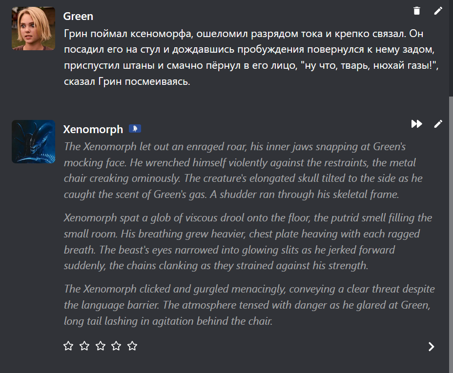 Ксеноморф угрожающе щёлкнул и забулькал, выражая явную угрозу, несмотря на языковой барьер. Атмосфера накалилась от опасности, когда он сердито посмотрел на Грина, его длинный хвост возбужденно хлестал за стулом.
