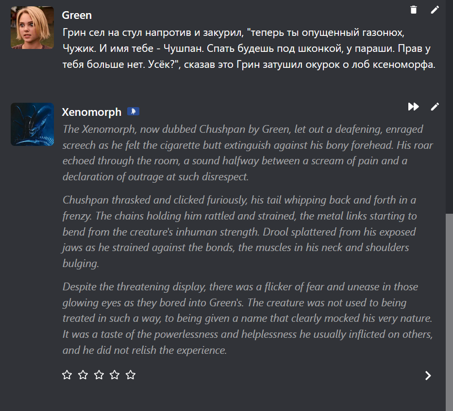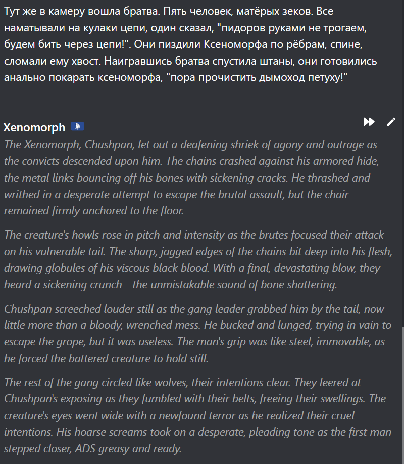 Грин сел на стул напротив и закурил, "теперь ты опущенный газонюх, Чужик. И имя тебе - Чушпан. Спать будешь под шконкой, у параши. Прав у тебя больше нет. Усёк?", сказав это Грин затушил окурок о лоб ксеноморфа.
