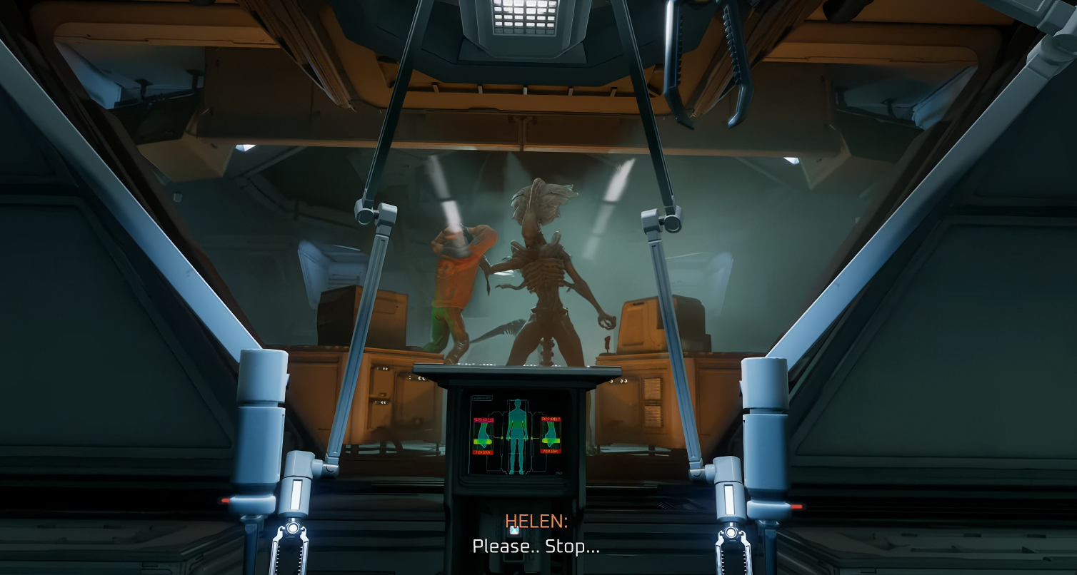 Ксеноморф издал яростный рёв, его внутренние челюсти щёлкнули, глядя на насмешливое лицо Грина. Он яростно рванулся из пут, металлический стул зловеще заскрипел. Удлинённый череп существа наклонился набок, когда он учуял запах газа Грина. Дрожь пробежала по его скелетному телу.
