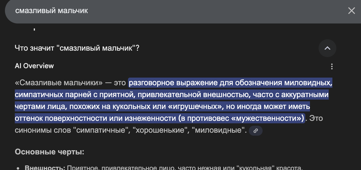 >>3464948 >Далбаеб, смазливый это симпатичный из-за своих мягких гладких черт лица, а не просто обладатель этих черт Говно, пиздишь опять. Вот тут какой то идиот принес от иишки значение >>3464911 просвящайся. "Образ указывает на лицо которое выглядит гладким, ухоженным ИЛИ намазанным" Ничто не мешает лицу при этом быть твердым, средней твердости или с резкими чертами.