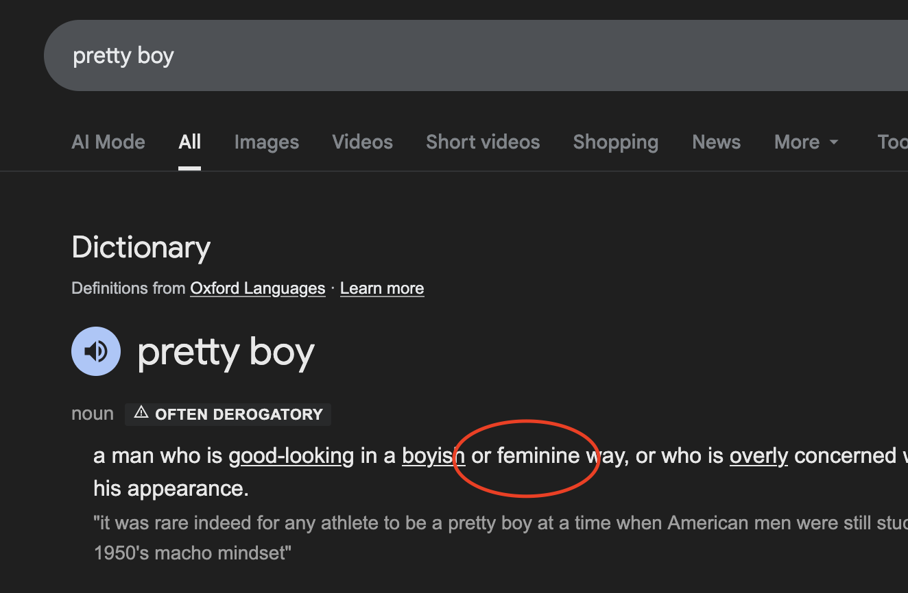 Это говорит о том, что резкие черты лица не означают однозначно маскулинность, а применимо и к претти боям, про которых точно нельзя сказать что их лица "мягкие" и округлые. Ты вертишься как уж на сковородке