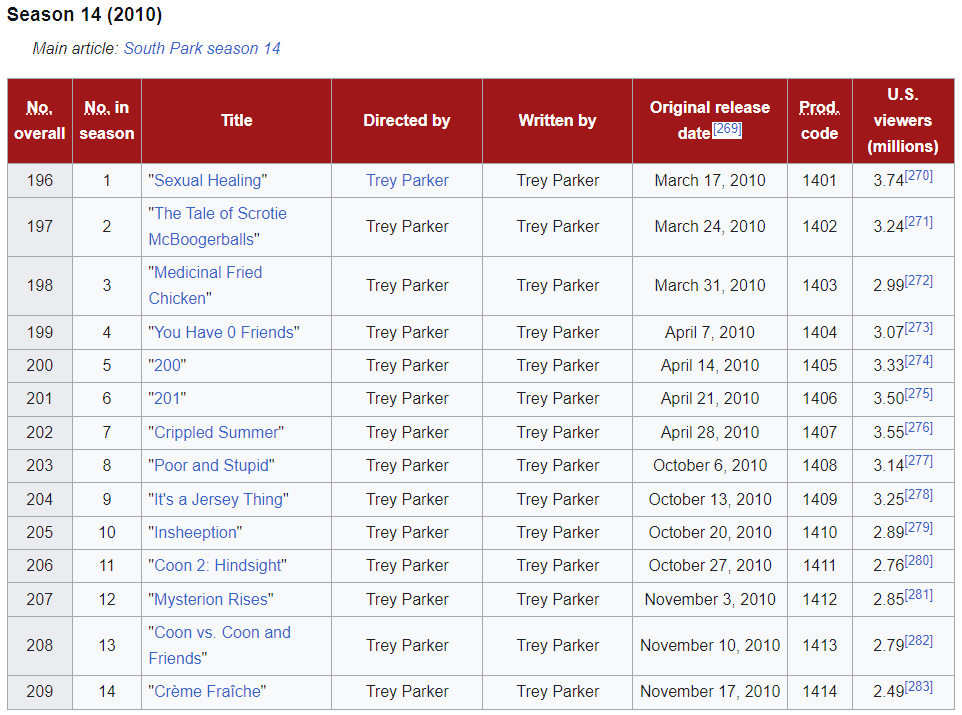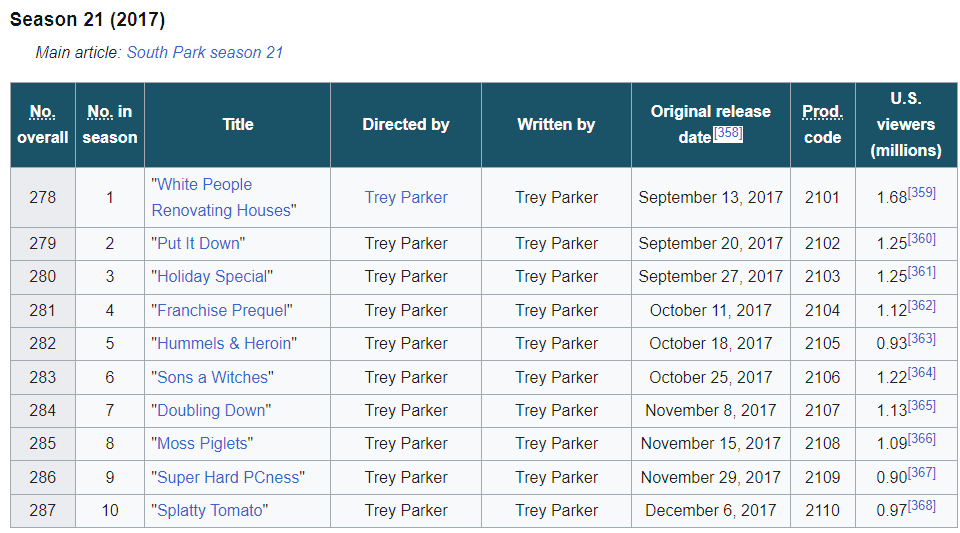 В колонке "U.S. viewers (millions)" на вики обычно указывается число линейных просмотров на телевидении (щас это Comedy Central) в день премьеры. а щас уже лет 10 как рейтинг подсчитывается по кросс-платформенным показателям. там несколько иные правила подсчёта.