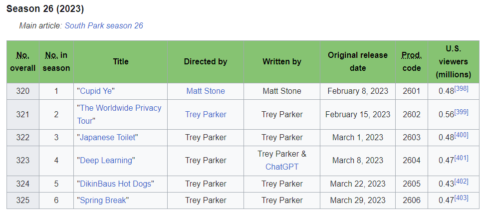 и да, эта серия с трампыпой в пустыне, она самая рейтинговая в этом году и за 26 лет, несмоотря на то что другие серии новых сезонов смотрели на кабельном иногда даже чаще, что видно из вики. Got a Nut например имеет на кабельном 840 тысяч, потому что после скандальной первой серии все ломанулись смотреть южный парк в первые мгновения премьеры, но по кросс-платформе показатели были примерно те же, что у первой серии. остальные серии смотрели меньше, потому что постепенно ущемленные базовички, которых, к сожалению, всё ещё много, в дикой обиде отсеялись от просмотра, но успех всё равно колоссальный.