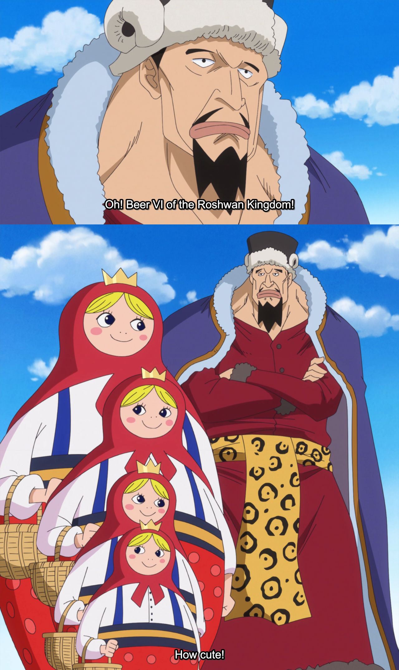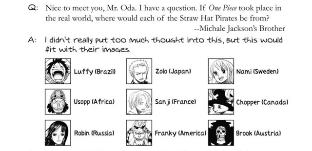 Ода лепит таких персонажей, каких хочет. У него буквально есть персонаж с именем Пиво 4, у которого дочь это матрешки. Не забываем про Короля Тако и Гам Бургера. Ну или та же Робин, которая по мнению Оды была бы русской, хотя с точки зрения ее персонажа там ничего особо и не намекает на это. Выкрикивает она испанские названия при использовании приемов. Да и по одежде ближе к Южной Америке. А Охара это вообще отсылка к Египту с Александрийской Библиотекой. Кусок это безумный микс массовой худ. культуры и истории завернутый в абсурдный мультяшный мир.