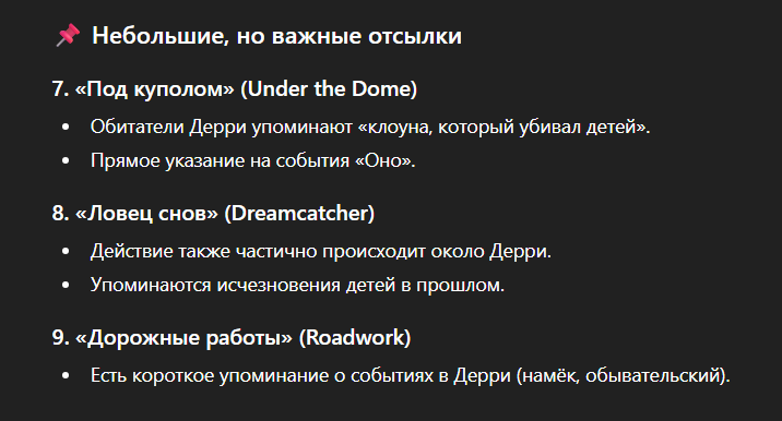 День канала. Гей-клуб "Сокол". Метод выпивания виски с лимонами Бена. Аль Пачино. Ричи Тозиер - Тедди Душан из Тела. Билл Денбро - Гордон Лашанс. Муж и отец абьюзеры. Интелюдии и Дерри Ньюс. Эдди и Дорси Конкориан. Стул наказания. Патрульный Нелл. Орнитология Стэна. Водонапорная башня Дэрри и утонувшие в ней дети. Завод Китчнера. Пожар в «Черном пятне» - Хромая лошадь. Сержант Уилсон. «Легион белой благопристойности» штата Мэн. Отец Майка и Бутч Бауэрс. В те годы Дерри оставался городом лесорубов, и в нем работали восемь или десять баров. Дик Холлоранн. Свадебный джаз. Буллинг над Беном в школе Омахи (Кэрри).Скворцы знают твое настоящее имя. Тема членов и сосков. Билл Денбро стал лысым. Через сумрак столб белеет, в полночь призрак столбенеет. Банда Брэдли. Смерть Джека Гамильтона. Повествование в настоящем времени. Ритуал в дымовой яме. Путешествие в прошлое Земли. Живодёр, членосос и псих Патрик Хокстеттер (Малыш из "Противостояния"). Проклятый дом на Нейболт-стрит - дом ведьмы из "Снов в ведьмином доме". Клод Эру и кровавая баня в "Серебряном долларе". Замогильная смена на радио. Черепаху стошнило нашей вселенной. Оно - самка, пожирательница миров. Чёрный подыхающий кошмар. Ритуал Чудь. У Бена самый большой. Дерри разваливался. Записи Майка выцветают.