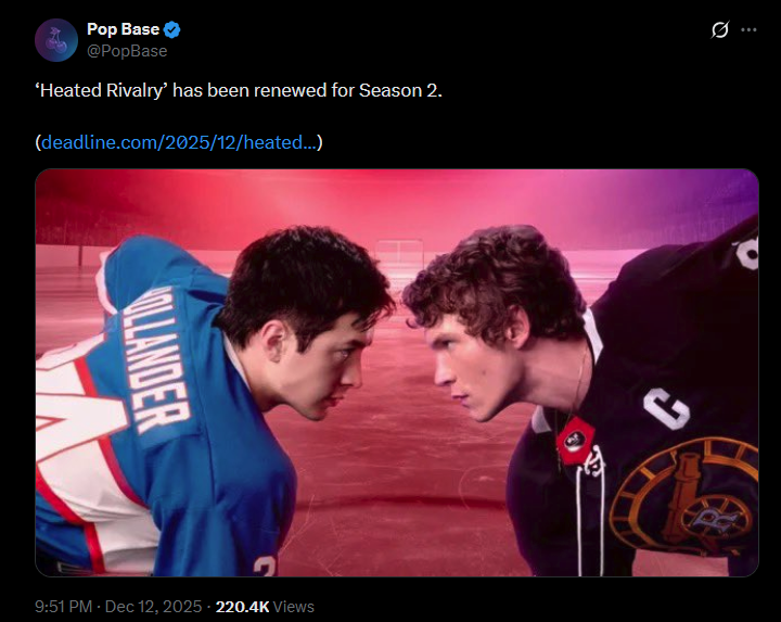 NY Times препарирует кейс "Жаркого соперничества": хоккейная эротическая мелодрама, не отличающаяся особенными художественными заслугами, в первую неделю продемонстрировала скромные цифры – около 30 млн минут, что не позволило проекту войти даже в топ-50, однако затем началось форменное безумие. Сработало сарафанное радио в TikTok и других социальных сетях, и к финалу сериала 26 декабря время смотрения выросло более чем в десять раз, превысив 324 млн минут. Накал не спадает, в начале нового года шоу продолжили смотреть и обсуждать – речь идет о более 254 млн минут – а когда звезда проекта Хадсон Уильямс появился на шоу Джимми Фэллона, толпу поклонников еле обуздали.