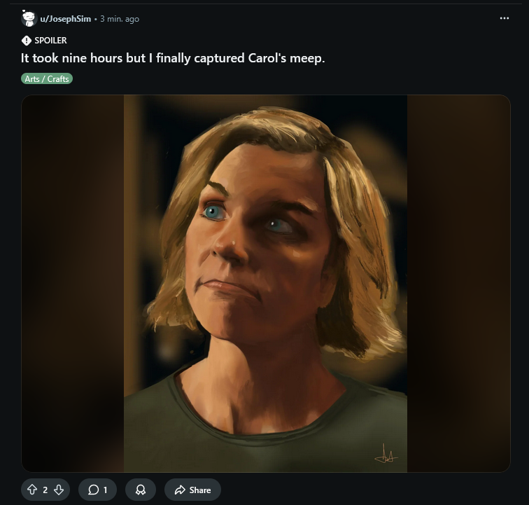 Кэрол кароче в битардство ушла - оступилась как узнала что ее не превратят, сычует на шее роя, а в клеточке роя пиратке видит нитакусика и испытывает эмпатию. Хороший ход, очень реалистично для обычного человека так-то, все мы сычи и хотим зоны комфорта. Ставлю плюсик.