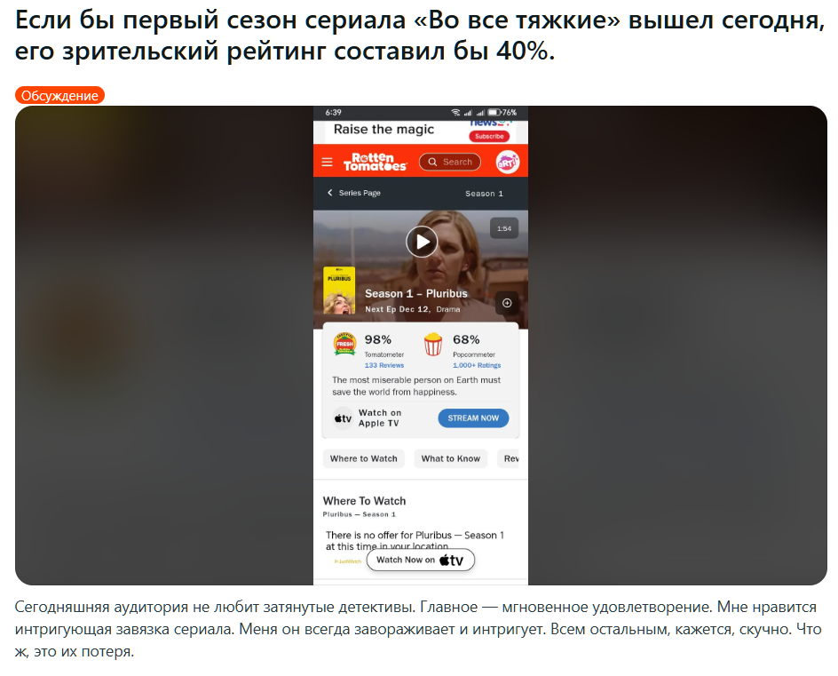 > затянутость повестования Bcs был намного затянутее. Я уже даже не помню, что там могли аж на 6 сезонов наснимать. Ну не было там событий на 60 часов экранного времени. Плюрибус пока что намного бодрее идёт. Да, местами тоже затягивают, не забывают впихнуть филлерные залипательные сцены с общим планом. Но это далеко не бекаса, где любят подолгу аутировать на то как муравьи едят мороженное или как готовятся рулетики и прочее подобное.