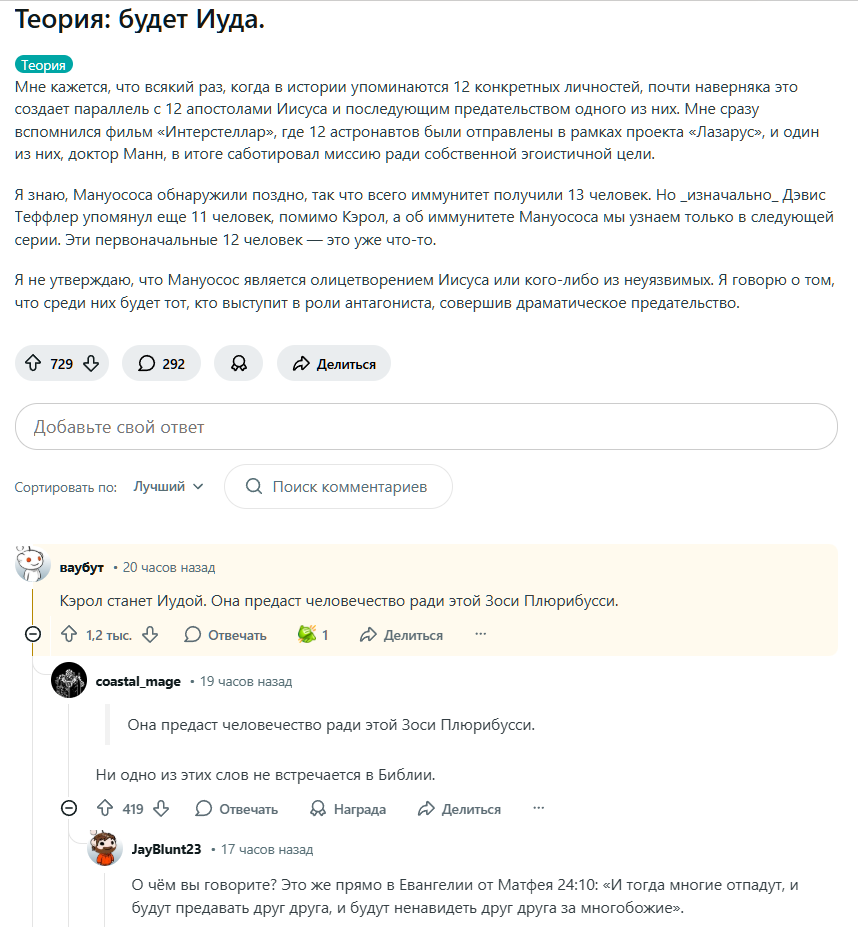 >>3459973 Честно говоря, чтобы понять «Плюрибус», нужно обладать очень высоким IQ. Юмор здесь чрезвычайно тонкий, и без глубокого понимания экзистенциального ужаса и постапокалиптической психологии большинство шуток останутся непонятыми для обычного зрителя. Также стоит отметить нигилистический взгляд Кэрол на вынужденное блаженство, который искусно вплетен в её сюжетную линию — её личная философия во многом опирается на литературу «Вторжения похитителей тел» и паранойю «Секретных материалов», например. Фанаты понимают это; у них есть интеллектуальные способности, чтобы по-настоящему оценить глубину этих коллективных сюжетных поворотов, осознать, что они не просто жуткие — они говорят нечто глубокое о ЧЕЛОВЕЧНОСТИ. В результате, люди, которым не нравится «Плюрибус», действительно идиоты — конечно же, они не оценят, например, гениальность медленного, нарастающего темпа Винса Гиллигана, который сам по себе является загадочной отсылкой к мучительному ожиданию между сезонами «Лучше звоните Солу», нагнетая невыносимое напряжение. Я сейчас ухмыляюсь, представляя, как эти тупоголовые простаки чешут затылки в недоумении, наблюдая за страданиями Кэрол на своих экранах Apple TV. Какие дураки... как мне их жаль. И да, кстати, у меня ЕСТЬ татуировка «Мы — это мы». И нет, вы её не увидите. Она только для тех, кто невосприимчив к этому — и даже им придётся продемонстрировать, что они предварительно сопротивлялись волне счастья.