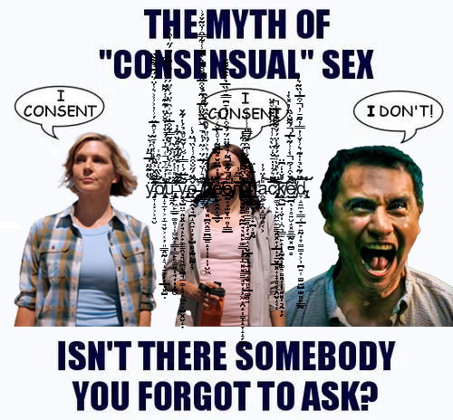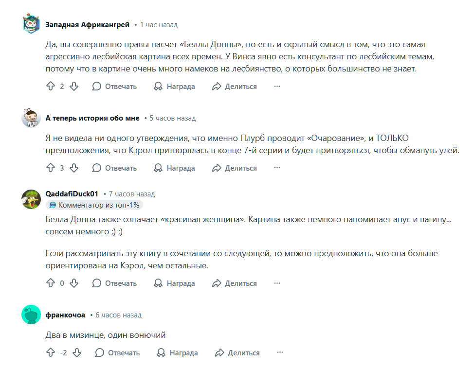 Один чел пишет, мол, Кэрол - не насильница. И перечисляет пункты почему: 1. Ну она же не первая предложила Зосю изнасиловать, сначала Хайв предложил. 2. Ну так-то Кэрол молодая ещё по сравнению с Хайвом. 3. Ну так-то она пьяная была же, значит не виновна. 4. Хайв такой убедительный. 5. Кэрол нравилась Зося, поэтому насилие не считается. 6. А ещё америкосовские законы не признают женщин насильниками.