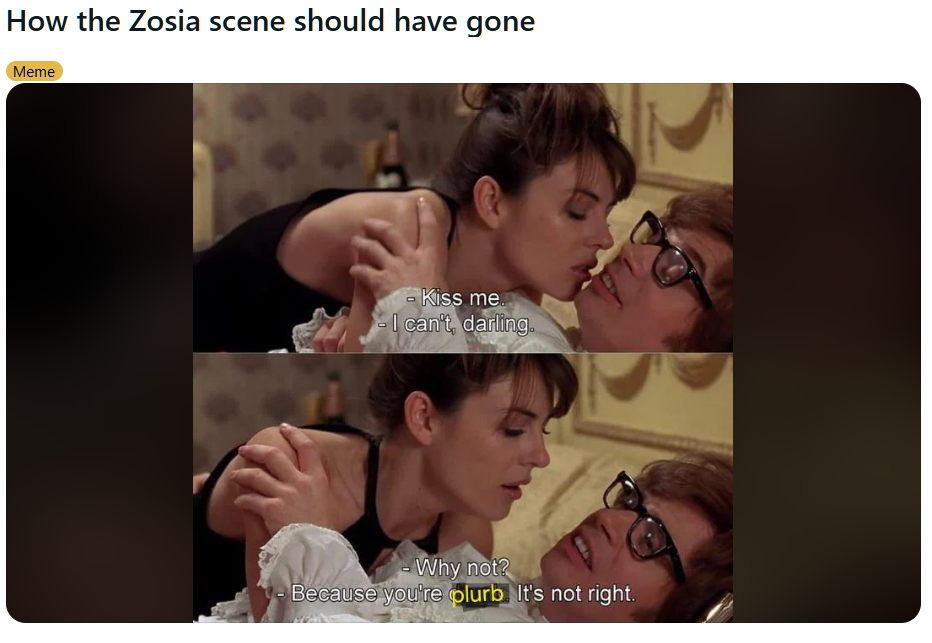 >>3459935 А здесь типа такого не было? Люди сразу говорили что будет лавстори между ким и зосей, но особо отбитые фанбойчики верещали "врети", "винс такую банальщину не сделает". Что с ебалом, даунята?